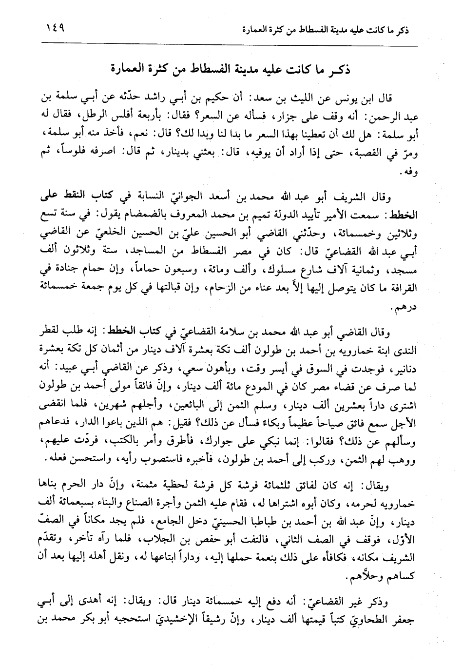 وقال القاضي أبو عبد الله محمد بن سلامة القضاعيّ في كتاب الخطط: إنه طلب لقطر الندى ابنة خمارويه بن أحمد بن طولون ألف تكة بعشرة آلاف دينار من أثمان كل تكة بعشرة دنانير، فوجدت في السوق في أيسر وقت، وبأهون سعي، وذكر عن القاضي أبي عبيد: أنه لما صرف عن قضاء مصر كان في المودع مائة ألف دينار، وإنّ فائقا مولى أحمد بن طولون اشترى دارا بعشرين ألف دينار، وسلم الثمن إلى البائعين، وأجلهم شهرين، فلما انقضى الأجل سمع فائق صياحا عظيما وبكاء فسأل عن ذلك؟ فقيل: هم الذين باعوا الدار، فدعاهم وسألهم عن ذلك؟ فقالوا: إنما نبكي على جوارك، فأطرق وأمر بالكتب، فردّت عليهم، ووهب لهم الثمن، وركب إلى أحمد بن طولون، فأخبره فاستصوب رأيه، واستحسن فعله.