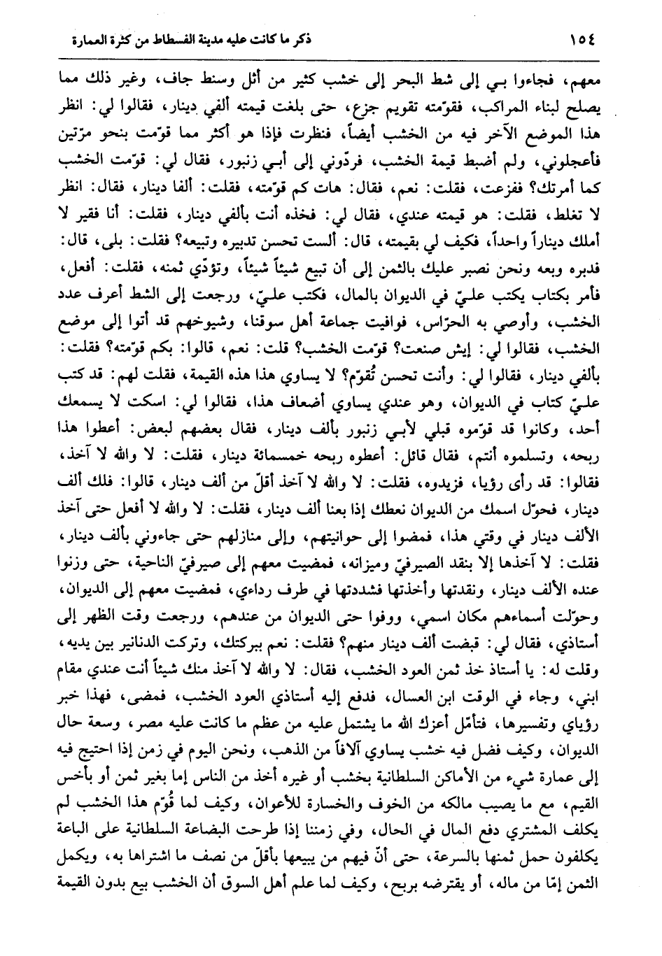 بألفي دينار، فقالوا لي: وأنت تحسن تقوّم؟ لا يساوي هذا هذه القيمة، فقلت لهم: قد كتب عليّ كتاب في الديوان، وهو عندي يساوي أضعاف هذا، فقالوا لي: اسكت لا يسمعك أحد، وكانوا قد قوّموه قبلي لأبي زنبور بألف دينار، فقال بعضهم لبعض: أعطوا هذا ربحه، وتسلموه أنتم، فقال قائل: أعطوه ربحه خمسمائة دينار، فقلت: لا والله لا آخذ، فقالوا: قد رأى رؤيا، فزيدوه، فقلت: لا والله لا آخذ أقلّ من ألف دينار، قالوا: فلك ألف دينار، فحوّل اسمك من الديوان نعطك إذا بعنا ألف دينار، فقلت: لا والله لا أفعل حتى آخذ الألف دينار في وقتي هذا، فمضوا إلى حوانيتهم، وإلى منازلهم حتى جاءوني بألف دينار، فقلت: لا آخذها إلا بنقد الصيرفيّ وميزانه، فمضيت معهم إلى صيرفيّ الناحية، حتى وزنوا عنده الألف دينار، ونقدتها وأخذتها فشددتها في طرف رداءي، فمضيت معهم إلى الديوان، وحوّلت أسماءهم مكان اسمي، ووفوا حتى الديوان من عندهم، ورجعت وقت الظهر إلى أستاذي، فقال لي: قبضت ألف دينار منهم؟ فقلت: نعم ببركتك، وتركت الدنانير بين يديه، وقلت له: يا أستاذ خذ ثمن العود الخشب، فقال: لا والله لا آخذ منك شيئا أنت عندي مقام ابني، وجاء في الوقت ابن العسال، فدفع إليه أستاذي العود الخشب، فمضى، فهذا خبر رؤياي وتفسيرها، فتأمّل أعزك الله ما يشتمل عليه من عظم ما كانت عليه مصر، وسعة حال الديوان، وكيف فضل فيه خشب يساوي آلافا من الذهب، ونحن اليوم في زمن إذا احتيج فيه إلى عمارة شيء من الأماكن السلطانية بخشب أو غيره أخذ من الناس إما بغير ثمن أو بأخس القيم، مع ما يصيب مالكه من الخوف والخسارة للأعوان، وكيف لما قوّم هذا الخشب لم يكلف المشتري دفع المال في الحال، وفي زمننا إذا طرحت البضاعة السلطانية على الباعة يكلفون حمل ثمنها بالسرعة، حتى أنّ فيهم من يبيعها بأقلّ من نصف ما اشتراها به، ويكمل الثمن إمّا من ماله، أو يقترضه بربح، وكيف لما علم أهل السوق أن الخشب بيع بدون القيمة