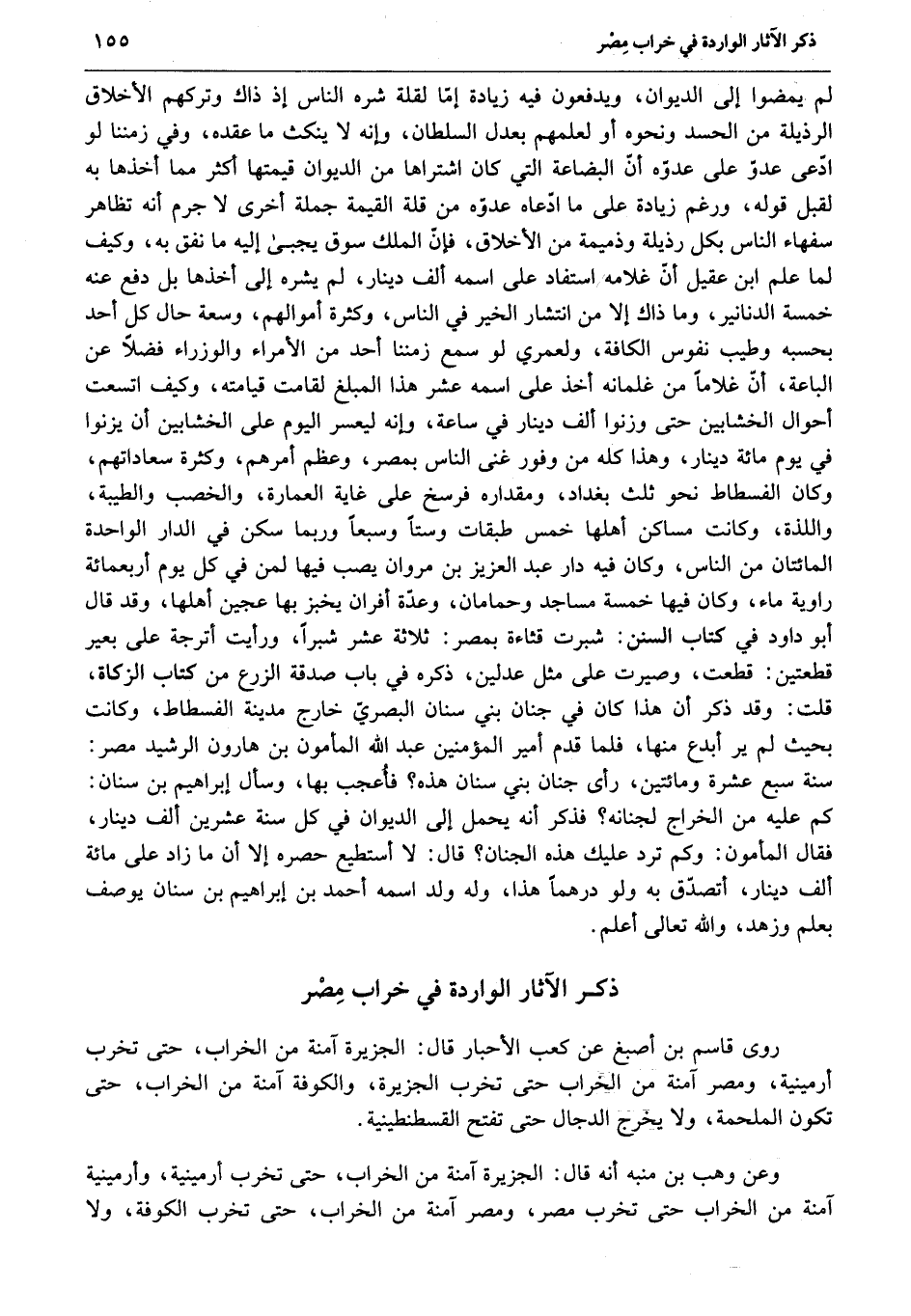 لم يمضوا إلى الديوان، ويدفعون فيه زيادة إمّا لقلة شره الناس إذ ذاك وتركهم الأخلاق الرذيلة من الحسد ونحوه أو لعلمهم بعدل السلطان، وإنه لا ينكث ما عقده، وفي زمننا لو ادّعى عدوّ على عدوّه أنّ البضاعة التي كان اشتراها من الديوان قيمتها أكثر مما أخذها به لقبل قوله، ورغم زيادة على ما ادّعاه عدوّه من قلة القيمة جملة أخرى لا جرم أنه تظاهر سفهاء الناس بكل رذيلة وذميمة من الأخلاق، فإنّ الملك سوق يجبى إليه ما نفق به، وكيف لما علم ابن عقيل أنّ غلامه استفاد على اسمه ألف دينار، لم يشره إلى أخذها بل دفع عنه خمسة الدنانير، وما ذاك إلا من انتشار الخير في الناس، وكثرة أموالهم، وسعة حال كل أحد بحسبه وطيب نفوس الكافة، ولعمري لو سمع زمننا أحد من الأمراء والوزراء فضلا عن الباعة، أنّ غلاما من غلمانه أخذ على اسمه عشر هذا المبلغ لقامت قيامته، وكيف اتسعت أحوال الخشابين حتى وزنوا ألف دينار في ساعة، وإنه ليعسر اليوم على الخشابين أن يزنوا في يوم مائة دينار، وهذا كله من وفور غنى الناس بمصر، وعظم أمرهم، وكثرة سعاداتهم، وكان الفسطاط نحو ثلث بغداد، ومقداره فرسخ على غاية العمارة، والخصب والطيبة، واللذة، وكانت مساكن أهلها خمس طبقات وستا وسبعا وربما سكن في الدار الواحدة المائتان من الناس، وكان فيه دار عبد العزيز بن مروان يصب فيها لمن في كل يوم أربعمائة راوية ماء، وكان فيها خمسة مساجد وحمامان، وعدّة أفران يخبز بها عجين أهلها، وقد قال أبو داود في كتاب السنن: شبرت قثاءة بمصر: ثلاثة عشر شبرا، ورأيت أترجة على بعير قطعتين: قطعت، وصيرت على مثل عدلين، ذكره في باب صدقة الزرع من كتاب الزكاة، قلت: وقد ذكر أن هذا كان في جنان بني سنان البصريّ خارج مدينة الفسطاط، وكانت بحيث لم ير أبدع منها، فلما قدم أمير المؤمنين عبد الله المأمون بن هارون الرشيد مصر: