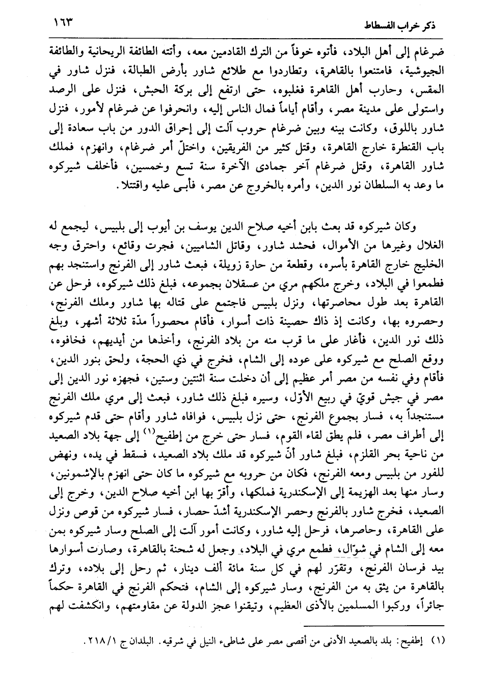 وكان شيركوه قد بعث بابن أخيه صلاح الدين يوسف بن أيوب إلى بلبيس، ليجمع له الغلال وغيرها من الأموال، فحشد شاور، وقاتل الشاميين، فجرت وقائع، واحترق وجه الخليج خارج القاهرة بأسره، وقطعة من حارة زويلة، فبعث شاور إلى الفرنج واستنجد بهم فطمعوا في البلاد، وخرج ملكهم مري من عسقلان بجموعه، فبلغ ذلك شيركوه، فرحل عن القاهرة بعد طول محاصرتها، ونزل بلبيس فاجتمع على قتاله بها شاور وملك الفرنج، وحصروه بها، وكانت إذا ذاك حصينة ذات أسوار، فأقام محصورا مدّة ثلاثة أشهر، وبلغ ذلك نور الدين، فأغار على ما قرب منه من بلاد الفرنج، وأخذها من أيديهم، فخافوه، ووقع الصلح مع شيركوه على عوده إلى الشام، فخرج في ذي الحجة، ولحق بنور الدين، فأقام وفي نفسه من مصر أمر عظيم إلى أن دخلت سنة اثنتين وستين، فجهزه نور الدين إلى مصر في جيش قويّ في ربيع الأوّل، وسيره فبلغ ذلك شاور، فبعث إلى مري ملك الفرنج مستنجدا به، فسار بجموع الفرنج، حتى نزل بلبيس، فوافاه شاور وأقام حتى قدم شيركوه إلى أطراف مصر، فلم يطق لقاء القوم، فسار حتى خرج من إطفيح «1» إلى جهة بلاد الصعيد من ناحية بحر القلزم، فبلغ شاور أنّ شيركوه قد ملك بلاد الصعيد، فسقط في يده، ونهض للفور من بلبيس ومعه الفرنج، فكان من حروبه مع شيركوه ما كان حتى انهزم بالأشمونين، وسار منها بعد الهزيمة إلى الإسكندرية فملكها، وأقرّ بها ابن أخيه صلاح الدين، وخرج إلى الصعيد، فخرج شاور بالفرنج وحصر الإسكندرية أشدّ حصار، فسار شيركوه من قوص ونزل على القاهرة، وحاصرها، فرحل إليه شاور، وكانت أمور آلت إلى الصلح وسار شيركوه بمن معه إلى الشام في شوّال، فطمع مري في البلاد، وجعل له شحنة بالقاهرة، وصارت أسوارها بيد فرسان الفرنج، وتقرّر لهم في كل سنة مائة ألف دينار، ثم رحل إلى بلاده، وترك بالقاهرة من يثق به من الفرنج، وسار شيركوه إلى الشام، فتحكم الفرنج في القاهرة حكما جائرا، وركبوا المسلمين بالأذى العظيم، وتيقنوا عجز الدولة عن مقاومتهم، وانكشفت لهم