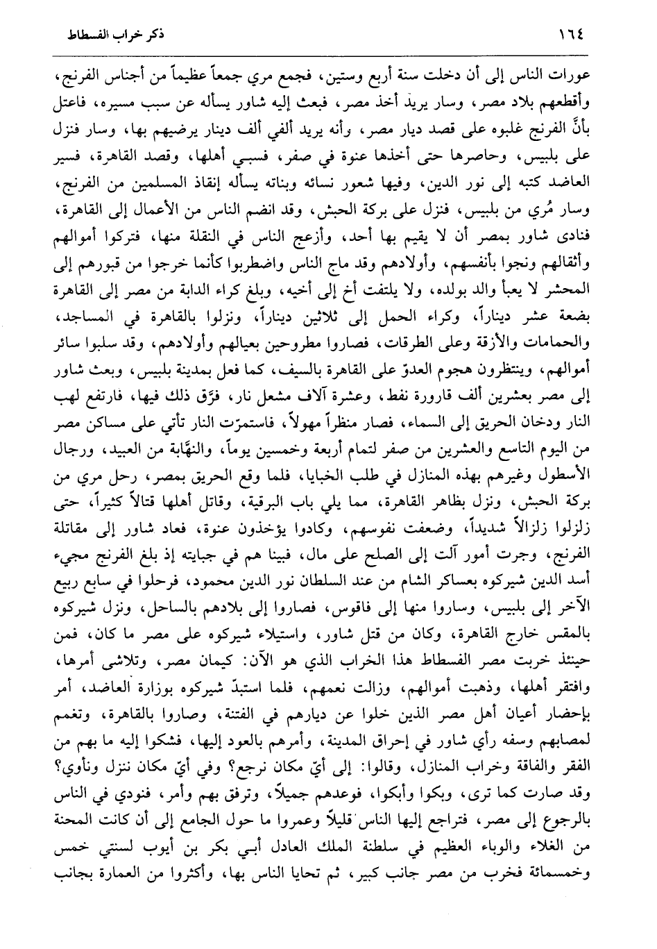 عورات الناس إلى أن دخلت سنة أربع وستين، فجمع مري جمعا عظيما من أجناس الفرنج، وأقطعهم بلاد مصر، وسار يريد أخذ مصر، فبعث إليه شاور يسأله عن سبب مسيره، فاعتل بأنّ الفرنج غلبوه على قصد ديار مصر، وأنه يريد ألفي ألف دينار يرضيهم بها، وسار فنزل على بلبيس، وحاصرها حتى أخذها عنوة في صفر، فسبي أهلها، وقصد القاهرة، فسير العاضد كتبه إلى نور الدين، وفيها شعور نسائه وبناته يسأله إنقاذ المسلمين من الفرنج، وسار مري من بلبيس، فنزل على بركة الحبش، وقد انضم الناس من الأعمال إلى القاهرة، فنادى شاور بمصر أن لا يقيم بها أحد، وأزعج الناس في النقلة منها، فتركوا أموالهم وأثقالهم ونجوا بأنفسهم، وأولادهم وقد ماج الناس واضطربوا كأنما خرجوا من قبورهم إلى المحشر لا يعبأ والد بولده، ولا يلتفت أخ إلى أخيه، وبلغ كراء الدابة من مصر إلى القاهرة بضعة عشر دينارا، وكراء الحمل إلى ثلاثين دينارا، ونزلوا بالقاهرة في المساجد، والحمامات والأزقة وعلى الطرقات، فصاروا مطروحين بعيالهم وأولادهم، وقد سلبوا سائر أموالهم، وينتظرون هجوم العدوّ على القاهرة بالسيف، كما فعل بمدينة بلبيس، وبعث شاور إلى مصر بعشرين ألف قارورة نفط، وعشرة آلاف مشعل نار، فرّق ذلك فيها، فارتفع لهب النار ودخان الحريق إلى السماء، فصار منظرا مهولا، فاستمرّت النار تأتي على مساكن مصر من اليوم التاسع والعشرين من صفر لتمام أربعة وخمسين يوما، والنّهابة من العبيد، ورجال الأسطول وغيرهم بهذه المنازل في طلب الخبايا، فلما وقع الحريق بمصر، رحل مري من بركة الحبش، ونزل بظاهر القاهرة، مما يلي باب البرقية، وقاتل أهلها قتالا كثيرا، حتى زلزلوا زلزالا شديدا، وضعفت نفوسهم، وكادوا يؤخذون عنوة، فعاد شاور إلى مقاتلة الفرنج، وجرت أمور آلت إلى الصلح على مال، فبينا هم في جبايته إذ بلغ الفرنج مجيء أسد الدين شيركوه بعساكر الشام من عند السلطان نور الدين محمود، فرحلوا في سابع ربيع الآخر إلى بلبيس، وساروا منها إلى فاقوس، فصاروا إلى بلادهم بالساحل، ونزل شيركوه بالمقس خارج القاهرة، وكان من قتل شاور، واستيلاء شيركوه على مصر ما كان، فمن حينئذ خربت مصر الفسطاط هذا الخراب الذي هو الآن: كيمان مصر، وتلاشى أمرها، وافتقر أهلها، وذهبت أموالهم، وزالت نعمهم، فلما استبدّ شيركوه بوزارة العاضد، أمر بإحضار أعيان أهل مصر الذين خلوا عن ديارهم في الفتنة، وصاروا بالقاهرة، وتغمم لمصابهم وسفه رأي شاور في إحراق المدينة، وأمرهم بالعود إليها، فشكوا إليه ما بهم من الفقر والفاقة وخراب المنازل، وقالوا: إلى أيّ مكان نرجع؟ وفي أيّ مكان ننزل ونأوي؟