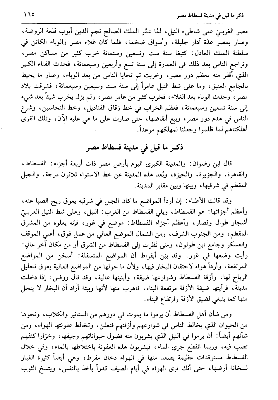 ومن شأن أهل الفسطاط أن يرموا ما يموت في دورهم من السنانير والكلاب، ونحوها من الحيوان الذي يخالط الناس في شوارعهم وأزقتهم فتعفن، وتخالط عفونتها الهواء، ومن شأنهم أيضا: أن يرموا في النيل الذي يشربون منه فضول حيواناتهم وجيفها، وخرّارا كنفهم تصب فيه، وربما انقطع جري الماء، فيشربون هذه العفونة باختلاطها بالماء، وفي خلال الفسطاط مستوقدات عظيمة يصعد منها في الهواء دخان مفرط، وهي أيضا كثيرة الغبار لسخانة أرضها، حتى أنك ترى الهواء في أيام الصيف كدرا يأخذ بالنفس، ويتسخ الثوب