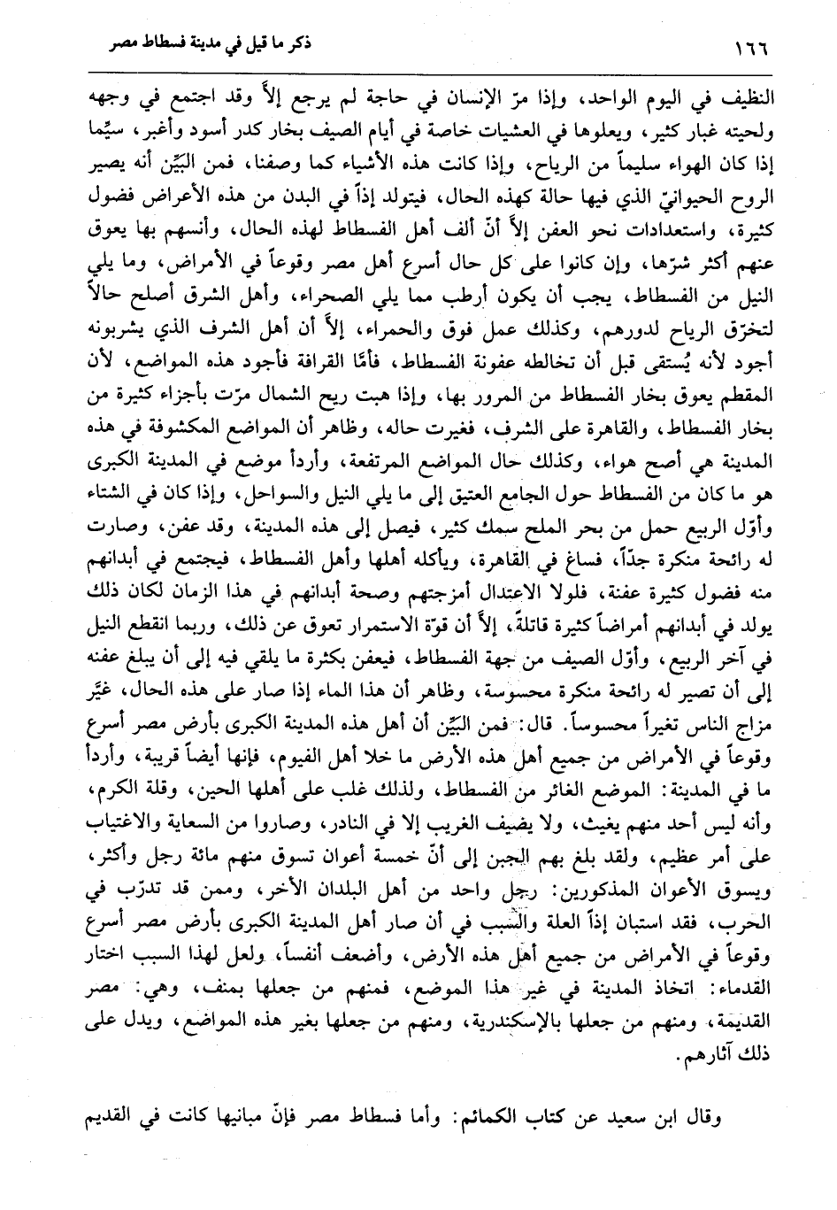 النظيف في اليوم الواحد، وإذا مرّ الإنسان في حاجة لم يرجع إلّا وقد اجتمع في وجهه ولحيته غبار كثير، ويعلوها في العشيات خاصة في أيام الصيف بخار كدر أسود وأغبر، سيّما إذا كان الهواء سليما من الرياح، وإذا كانت هذه الأشياء كما وصفنا، فمن البيّن أنه يصير الروح الحيوانيّ الذي فيها حالة كهذه الحال، فيتولد إذا في البدن من هذه الأعراض فضول كثيرة، واستعدادات نحو العفن إلّا أنّ ألف أهل الفسطاط لهذه الحال، وأنسهم بها يعوق عنهم أكثر شرّها، وإن كانوا على كل حال أسرع أهل مصر وقوعا في الأمراض، وما يلي النيل من الفسطاط، يجب أن يكون أرطب مما يلي الصحراء، وأهل الشرق أصلح حالا لتخرّق الرياح لدورهم، وكذلك عمل فوق والحمراء، إلّا أن أهل الشرف الذي يشربونه أجود لأنه يستقى قبل أن تخالطه عفونة الفسطاط، فأمّا القرافة فأجود هذه المواضع، لأن المقطم يعوق بخار الفسطاط من المرور بها، وإذا هبت ريح الشمال مرّت بأجزاء كثيرة من بخار الفسطاط، والقاهرة على الشرف، فغيرت حاله، وظاهر أن المواضع المكشوفة في هذه المدينة هي أصح هواء، وكذلك حال المواضع المرتفعة، وأردأ موضع في المدينة الكبرى هو ما كان من الفسطاط حول الجامع العتيق إلى ما يلي النيل والسواحل، وإذا كان في الشتاء وأوّل الربيع حمل من بحر الملح سمك كثير، فيصل إلى هذه المدينة، وقد عفن، وصارت له رائحة منكرة جدّا، فساغ في القاهرة، ويأكله أهلها وأهل الفسطاط، فيجتمع في أبدانهم منه فضول كثيرة عفنة، فلولا الاعتدال أمزجتهم وصحة أبدانهم في هذا الزمان لكان ذلك يولد في أبدانهم أمراضا كثيرة، قاتلة، إلّا أن قوّة الاستمرار تعوق عن ذلك، وربما انقطع النيل في آخر الربيع، وأوّل الصيف من جهة الفسطاط، فيعفن بكثرة ما يلقي فيه إلى أن يبلغ عفنه إلى أن تصير له رائحة منكرة محسوسة، وظاهر أن هذا الماء إذا صار على هذه الحال، غيّر مزاج الناس تغيرا محسوسا. قال: فمن البيّن أن أهل هذه المدينة الكبرى بأرض مصر أسرع وقوعا في الأمراض من جميع أهل هذه الأرض ما خلا أهل الفيوم، فإنها أيضا قريبة، وأردأ ما في المدينة: الموضع الغائر من الفسطاط، ولذلك غلب على أهلها الحين، وقلة الكرم، وأنه ليس أحد منهم يغيث، ولا يضيف الغريب إلا في النادر، وصاروا من السعاية والاغتياب على أمر عظيم، ولقد بلغ بهم الجبن إلى أنّ خمسة أعوان تسوق منهم مائة رجل وأكثر، ويسوق الأعوان المذكورين: رجل واحد من أهل البلدان الأخر، وممن قد تدرّب في الحرب، فقد استبان إذا العلة والسبب في أن صار أهل المدينة الكبرى بأرض مصر أسرع وقوعا في الأمراض من جميع أهل هذه الأرض، وأضعف أنفسا، ولعل لهذا السبب اختار القدماء: اتخاذ المدينة في غير هذا الموضع، فمنهم من جعلها بمنف، وهي: مصر القديمة، ومنهم من جعلها بالإسكندرية، ومنهم من جعلها بغير هذه المواضع، ويدل على ذلك آثارهم.