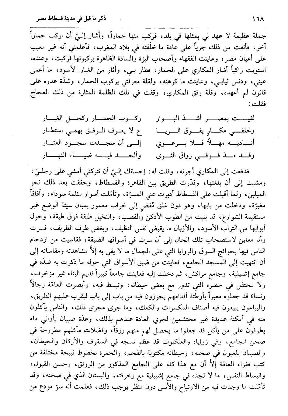 فدفعت إلى المكاري أجرته، وقلت له: إحسانك إليّ أن تتركني أمشي على رجليّ، ومشيت إلى أن بلغتها، وقدّرت الطريق بين القاهرة والفسطاط، وحققت بعد ذلك نحو الميلين، ولما أقبلت على الفسطاط أدبرت عني المسرّة، وتأمّلت أسوار مثلمة سوداء، وآفاقا مغبرّة، ودخلت من بابها، وهو دون غلق مفض إلى خراب معمور بمبان سيئة الوضع غير مستقيمة الشوارع، قد بنيت من الطوب الأدكن والقصب، والنخيل طبقة فوق طبقة، وحول أبوابها من التراب الأسود، والأزبال ما يقبض نفس النظيف، ويغض طرف الطريف، فسرت وأنا معاين لاستصحاب تلك الحال إلى أن سرت في أسواقها الضيقة، فقاسيت من ازدحام الناس فيها بحوائج السوق والروايا التي على الجمال ما لا يفي به إلّا مشاهدته ومقاساته إلى أن انتهيت إلى المسجد الجامع، فعاينت من ضيق الأسواق التي حوله ما ذكرت به ضدّه في جامع إشبيلية، وجامع مراكش، ثم دخلت إليه فعاينت جامعا كبيرا قديم البناء غير مزخرف، ولا محتفل في حصره التي تدور مع بعض حيطانه، وتبسط فيه، وأبصرت العامّة رجالا ونساء قد جعلوه معبرا بأوطئة أقدامهم يجوزون فيه من باب إلى باب ليقرب عليهم الطريق، والبياعون يبيعون فيه أصناف المكسرات والكعك، وما جرى مجرى ذلك، والناس يأكلون منه في أمكنة عديدة غير محتشمين لجري العادة عندهم بذلك، وعدّة صبيان بأواني ماء يطوفون على من يأكل قد جعلوا ما يحصل لهم منهم رزقا، وفضلات مآكلهم مطروحة في صحن الجامع، وفي زواياه والعنكبوت قد عظم نسجه في السقوف والأركان والحيطان، والصبيان يلعبون في صحنه، وحيطانه مكتوبة بالفحم، والحمرة بخطوط قبيحة مختلفة من كتب فقراء العامّة إلّا أن مع هذا كله على الجامع المذكور من الرونق، وحسن القبول، وانبساط النفس، ما لا تجده في جامع إشبيلية مع زخرفته، والبستان الذي في صحنه، وقد تأمّلت ما وجدت فيه من الارتياح والأنس دون منظر يوجب ذلك، فعلمت أنه سرّ مودع من