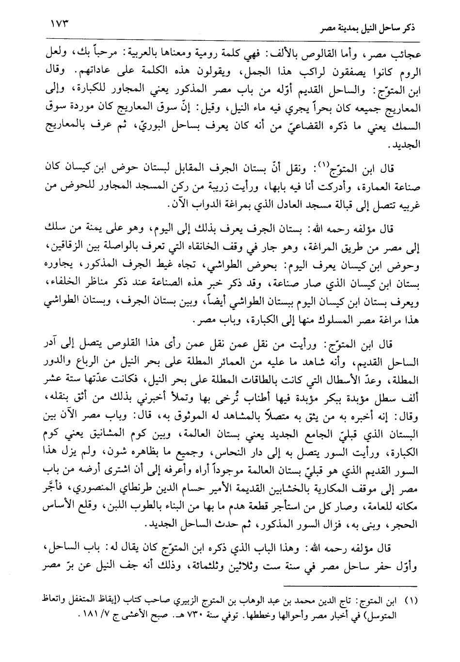 قال ابن المتوّج: ورأيت من نقل عمن نقل عمن رأى هذا القلوص يتصل إلى آدر الساحل القديم، وأنه شاهد ما عليه من العمائر المطلة على بحر النيل من الرباع والدور المطلة، وعدّ الأسطال التي كانت بالطاقات المطلة على بحر النيل، فكانت عدّتها ستة عشر ألف سطل مؤبدة ببكر مؤبدة فيها أطناب ترخى بها وتملأ أخبرني بذلك من أثق بنقله، وقال: إنه أخبره به من يثق به متصلا بالمشاهد له الموثوق به، قال: وباب مصر الآن بين البستان الذي قبليّ الجامع الجديد يعني بستان العالمة، وبين كوم المشانيق يعني كوم الكبارة، ورأيت السور يتصل به إلى دار النحاس، وجميع ما بظاهره شون، ولم يزل هذا السور القديم الذي هو قبليّ بستان العالمة موجودا أراه وأعرفه إلى أن اشترى أرضه من باب مصر إلى موقف المكارية بالخشابين القديمة الأمير حسام الدين طرنطاي المنصوري، فأجّر مكانه للعامة، وصار كل من استأجر قطعة هدم ما بها من البناء بالطوب اللبن، وقلع الأساس الحجر، وبنى به، فزال السور المذكور، ثم حدث الساحل الجديد.