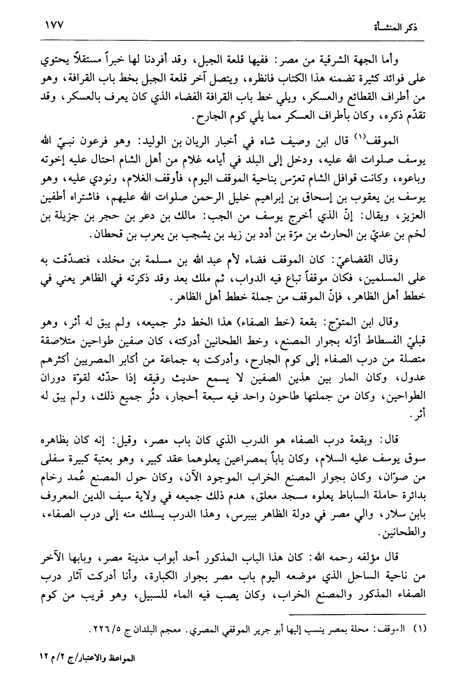 قال مؤلفه رحمه الله: كان هذا الباب المذكور أحد أبواب مدينة مصر، وبابها الآخر من ناحية الساحل الذي موضعه اليوم باب مصر بجوار الكبارة، وأنا أدركت آثار درب الصفاء المذكور والمصنع الخراب، وكان يصب فيه الماء للسبيل، وهو قريب من كوم