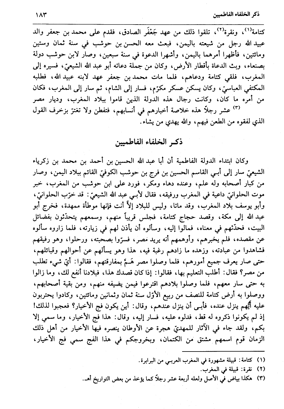 كتامة «1» ، ونقرة «2» ، تلقوا ذلك من عهد جعفر الصادق، فقدم على محمد بن جعفر والد عبيد الله رجل من شيعته باليمن، فبعث معه الحسن بن حوشب في سنة ثمان وستين ومائتين، فأظهرا أمرهما باليمن، وأشهرا الدعوة في سنة سبعين، وصار لابن حوشب دولة بصنعاء، وبث الدعاة بأقطار الأرض، وكان من جملة دعاته أبو عبد الله الشيعيّ، فسيره إلى المغرب، فلقي كتامة ودعاهم، فلما مات محمد بن جعفر عهد لابنه عبيد الله، فطلبه المكتفي العباسيّ، وكان يسكن عسكر مكرّم، فسار إلى الشام، ثم سار إلى المغرب، فكان من أمره ما كان، وكانت رجال هذه الدولة الذين قاموا ببلاد المغرب، وديار مصر «3» عشر رجلا هذه خلاصة أخبارهم في أنسابهم، فتفطن ولا تغترّ بزخرف القول الذي لفقوه من الطعن فيهم، والله يهدي من يشاء.