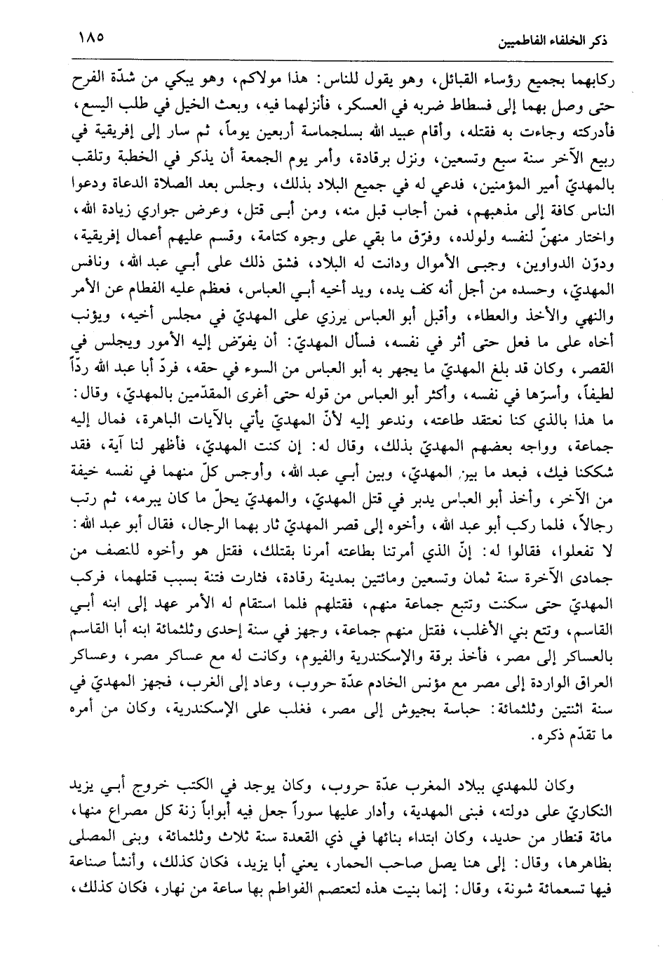 لا تفعلوا، فقالوا له: إنّ الذي أمرتنا بطاعته أمرنا بقتلك، فقتل هو وأخوه للنصف من جمادى الآخرة سنة ثمان وتسعين ومائتين بمدينة رقادة، فثارت فتنة بسبب قتلهما، فركب المهديّ حتى سكنت وتتبع جماعة منهم، فقتلهم فلما استقام له الأمر عهد إلى ابنه أبي القاسم، وتتبع بني الأغلب، فقتل منهم جماعة، وجهز في سنة إحدى وثلثمائة ابنه أبا القاسم بالعساكر إلى مصر، فأخذ برقة والإسكندرية والفيوم، وكانت له مع عساكر مصر، وعساكر العراق الواردة إلى مصر مع مؤنس الخادم عدّة حروب، وعاد إلى الغرب، فجهز المهديّ في سنة اثنتين وثلثمائة: حباسة بجيوش إلى مصر، فغلب على الإسكندرية، وكان من أمره ما تقدّم ذكره.