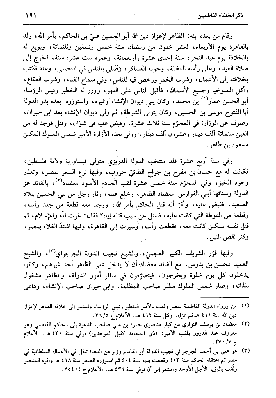 وقام من بعده ابنه: الظاهر لإعزاز دين الله أبو الحسين عليّ بن الحاكم، بأمر الله، ولد بالقاهرة يوم الأربعاء، لعشر خلون من رمضان سنة خمس وتسعين وثلثمائة، وبويع له بالخلافة يوم عيد النحر، سنة إحدى عشرة وأربعمائة، وعمره ست عشرة سنة، فخرج إلى صلاة العيد، وعلى رأسه المظلة، وحوله العساكر، وصلى بالناس في المصلى، وعاد فكتب بخلافته إلى الأعمال، وشرب الخمر ورخص فيه للناس، وفي سماع الغناء، وشرب الفقاع، وأكل الملوخيا وجميع الأسماك، فأقبل الناس على اللهو، ووزر له الخطير رئيس الرؤساء أبو الحسن عمار «1» بن محمد، وكان يلي ديوان الإنشاء وغيره، واستوزره بعده بدر الدولة أبا الفتوح موسى بن الحسين، وكان يتولى الشرطة، ثم ولي ديوان الإنشاء بعد ابن حيران، وصرف عن الوزارة في المحرّم سنة ثلاث عشرة، وقبض عليه في شوّال، وقتل فوجد له من العين ستمائة ألف دينار وعشرون ألف دينار، وولي بعده الأزارة الأمير شمس الملوك المكين مسعود بن طاهر.