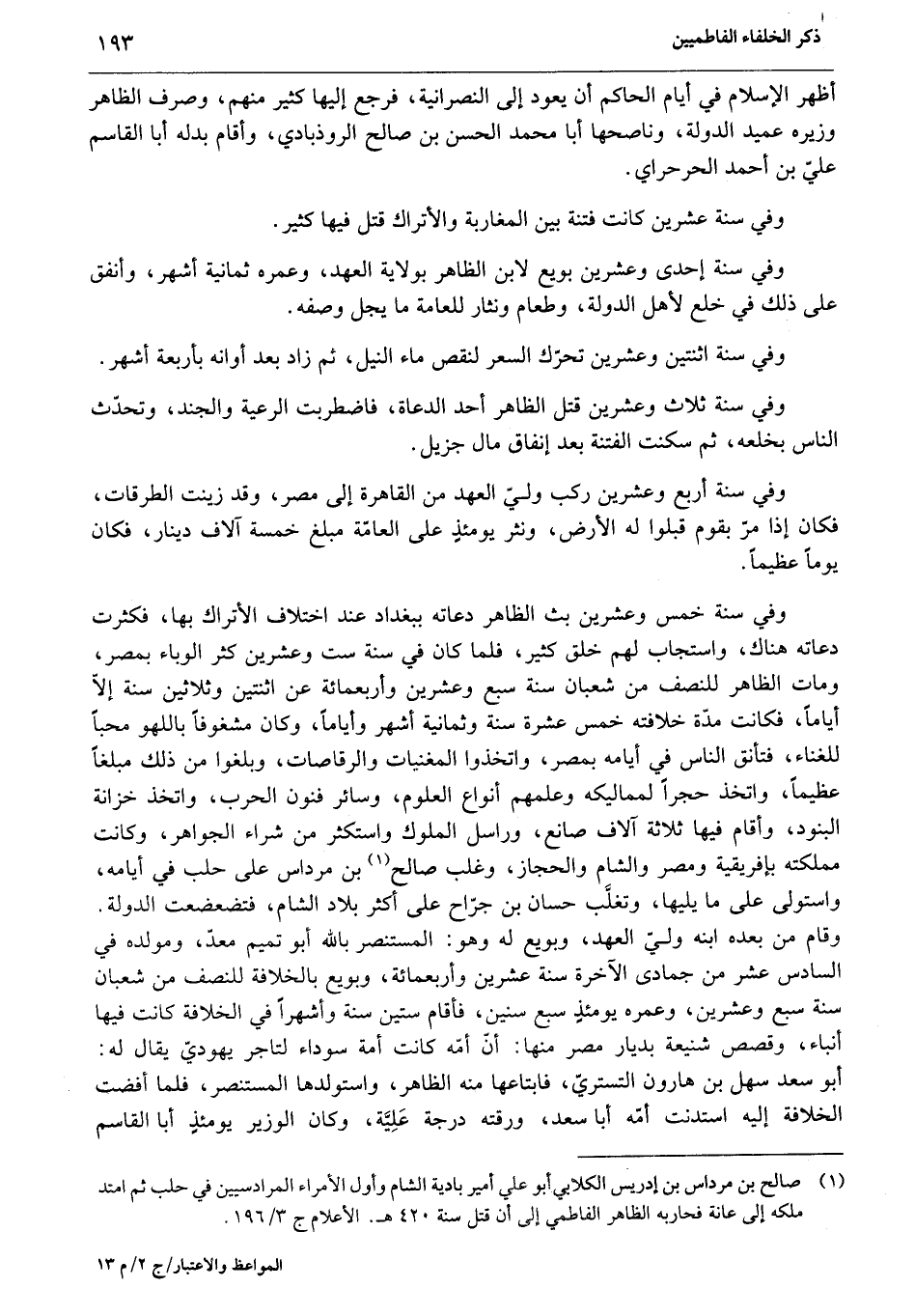 وفي سنة خمس وعشرين بث الظاهر دعاته ببغداد عند اختلاف الأتراك بها، فكثرت دعاته هناك، واستجاب لهم خلق كثير، فلما كان في سنة ست وعشرين كثر الوباء بمصر، ومات الظاهر للنصف من شعبان سنة سبع وعشرين وأربعمائة عن اثنتين وثلاثين سنة إلّا أياما، فكانت مدّة خلافته خمس عشرة سنة وثمانية أشهر وأياما، وكان مشغوفا باللهو محبا للغناء، فتأنق الناس في أيامه بمصر، واتخذوا المغنيات والرقاصات، وبلغوا من ذلك مبلغا عظيما، واتخذ حجرا لمماليكه وعلمهم أنواع العلوم، وسائر فنون الحرب، واتخذ خزانة البنود، وأقام فيها ثلاثة آلاف صانع، وراسل الملوك واستكثر من شراء الجواهر، وكانت مملكته بإفريقية ومصر والشام والحجاز، وغلب صالح «1» بن مرداس على حلب في أيامه، واستولى على ما يليها، وتغلّب حسان بن جرّاح على أكثر بلاد الشام، فتضعضعت الدولة.
