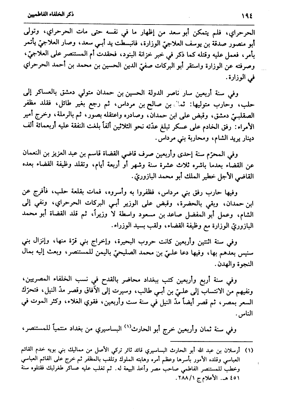 وفيها حارب رفق بني مرداس، فظفروا به وأسروه، فمات بقلعة حلب، فأفرج عن ابن حمدان، وبقي بالحضرة، وقبض على الوزير أبي البركات الحرحراي، ونفي إلى الشام، وعمل أبو المفضل صاعد بن مسعود واسطة لا وزيرا، ثم قلد القضاة أبو محمد البازوريّ الوزارة مع وظيفة القضاء، ولقب بسيد الوزراء.