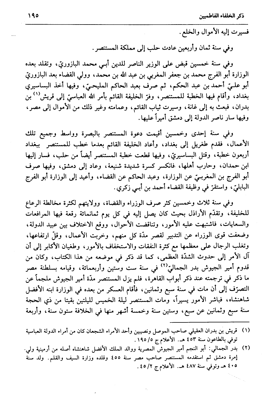وفي سنة إحدى وخمسين أقيمت دعوة المستنصر بالبصرة وواسط وجميع تلك الأعمال، فقدم طغريل إلى بغداد، وأعاد الخليفة القائم بعد ما خطب للمستنصر ببغداد أربعون خطبة، وقتل البساسيريّ، وفيها قطعت خطبة المستنصر أيضا من حلب، فسار إليها ابن حمدان، وحارب أهلها، فانكسر كسرة شديدة شنيعة، وعاد إلى دمشق، وفيها صرف أبو الفرج بن المغربيّ عن الوزارة، وعبد الحاكم عن القضاء، وأعيد إلى الوزارة أبو الفرج البابليّ، واستقرّ في وظيفة القضاء أحمد بن أبي زكري.