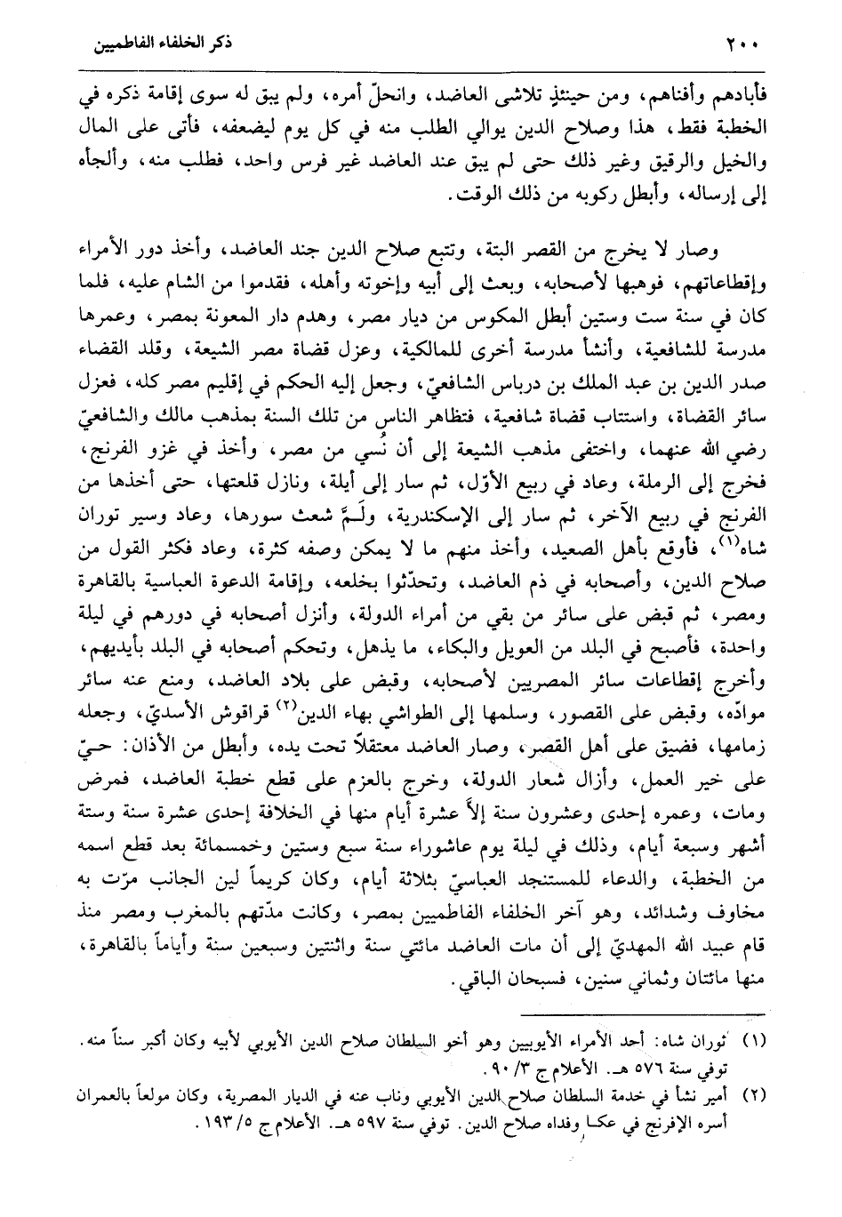 وصار لا يخرج من القصر البتة، وتتبع صلاح الدين جند العاضد، وأخذ دور الأمراء وإقطاعاتهم، فوهبها لأصحابه، وبعث إلى أبيه وإخوته وأهله، فقدموا من الشام عليه، فلما كان في سنة ست وستين أبطل المكوس من ديار مصر، وهدم دار المعونة بمصر، وعمرها مدرسة للشافعية، وأنشأ مدرسة أخرى للمالكية، وعزل قضاة مصر الشيعة، وقلد القضاء صدر الدين بن عبد الملك بن درباس الشافعيّ، وجعل إليه الحكم في إقليم مصر كله، فعزل سائر القضاة، واستتاب قضاة شافعية، فتظاهر الناس من تلك السنة بمذهب مالك والشافعيّ رضي الله عنهما، واختفى مذهب الشيعة إلى أن نسي من مصر، وأخذ في غزو الفرنج، فخرج إلى الرملة، وعاد في ربيع الأوّل، ثم سار إلى أيلة، ونازل قلعتها، حتى أخذها من الفرنج في ربيع الآخر، ثم سار إلى الإسكندرية، ولمّ شعث سورها، وعاد وسير توران شاه «1» ، فأوقع بأهل الصعيد، وأخذ منهم ما لا يمكن وصفه كثرة، وعاد فكثر القول من صلاح الدين، وأصحابه في ذم العاضد، وتحدّثوا بخلعه، وإقامة الدعوة العباسية بالقاهرة ومصر، ثم قبض على سائر من بقي من أمراء الدولة، وأنزل أصحابه في دورهم في ليلة واحدة، فأصبح في البلد من العويل والبكاء، ما يذهل، وتحكم أصحابه في البلد بأيديهم، وأخرج إقطاعات سائر المصريين لأصحابه، وقبض على بلاد العاضد، ومنع عنه سائر موادّه، وقبض على القصور، وسلمها إلى الطواشي بهاء الدين «2» قراقوش الأسديّ، وجعله زمامها، فضيق على أهل القصر، وصار العاضد معتقلا تحت يده، وأبطل من الأذان: حيّ على خير العمل، وأزال شعار الدولة، وخرج بالعزم على قطع خطبة العاضد، فمرض ومات، وعمره إحدى وعشرون سنة إلّا عشرة أيام منها في الخلافة إحدى عشرة سنة وستة أشهر وسبعة أيام، وذلك في ليلة يوم عاشوراء سنة سبع وستين وخمسمائة بعد قطع اسمه من الخطبة، والدعاء للمستنجد العباسيّ بثلاثة أيام، وكان كريما لين الجانب مرّت به مخاوف وشدائد، وهو آخر الخلفاء الفاطميين بمصر، وكانت مدّتهم بالمغرب ومصر منذ قام عبيد الله المهديّ إلى أن مات العاضد مائتي سنة واثنتين وسبعين سنة وأياما بالقاهرة، منها مائتان وثماني سنين، فسبحان الباقي.