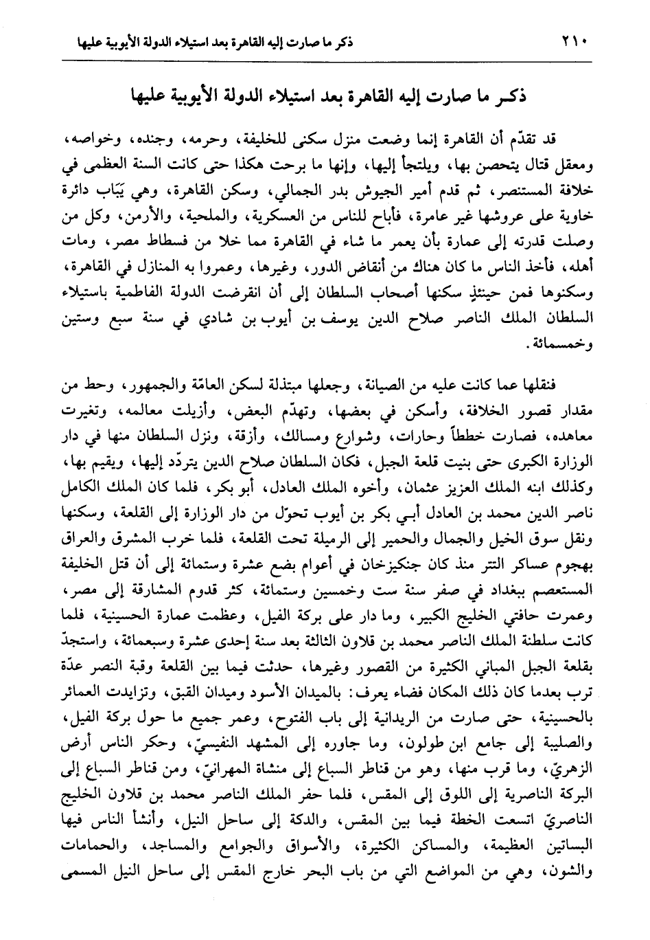 فنقلها عما كانت عليه من الصيانة، وجعلها مبتذلة لسكن العامّة والجمهور، وحط من مقدار قصور الخلافة، وأسكن في بعضها، وتهدّم البعض، وأزيلت معالمه، وتغيرت معاهده، فصارت خططا وحارات، وشوارع ومسالك، وأزقة، ونزل السلطان منها في دار الوزارة الكبرى حتى بنيت قلعة الجبل، فكان السلطان صلاح الدين يتردّد إليها، ويقيم بها، وكذلك ابنه الملك العزيز عثمان، وأخوه الملك العادل، أبو بكر، فلما كان الملك الكامل ناصر الدين محمد بن العادل أبي بكر بن أيوب تحوّل من دار الوزارة إلى القلعة، وسكنها ونقل سوق الخيل والجمال والحمير إلى الرميلة تحت القلعة، فلما خرب المشرق والعراق بهجوم عساكر التتر منذ كان جنكيزخان في أعوام بضع عشرة وستمائة إلى أن قتل الخليفة المستعصم ببغداد في صفر سنة ست وخمسين وستمائة، كثر قدوم المشارقة إلى مصر، وعمرت حافتي الخليج الكبير، وما دار على بركة الفيل، وعظمت عمارة الحسينية، فلما كانت سلطنة الملك الناصر محمد بن قلاون الثالثة بعد سنة إحدى عشرة وسبعمائة، واستجدّ بقلعة الجبل المباني الكثيرة من القصور وغيرها، حدثت فيما بين القلعة وقبة النصر عدّة ترب بعد ما كان ذلك المكان فضاء يعرف: بالميدان الأسود وميدان القبق، وتزايدت العمائر بالحسينية، حتى صارت من الريدانية إلى باب الفتوح، وعمر جميع ما حول بركة الفيل، والصليبة إلى جامع ابن طولون، وما جاوره إلى المشهد النفيسيّ، وحكر الناس أرض الزهريّ، وما قرب منها، وهو من قناطر السباع إلى منشاة المهرانيّ، ومن قناطر السباع إلى البركة الناصرية إلى اللوق إلى المقس، فلما حفر الملك الناصر محمد بن قلاون الخليج الناصريّ اتسعت الخطة فيما بين المقس، والدكة إلى ساحل النيل، وأنشأ الناس فيها البساتين العظيمة، والمساكن الكثيرة، والأسواق والجوامع والمساجد، والحمامات والشون، وهي من المواضع التي من باب البحر خارج المقس إلى ساحل النيل المسمى