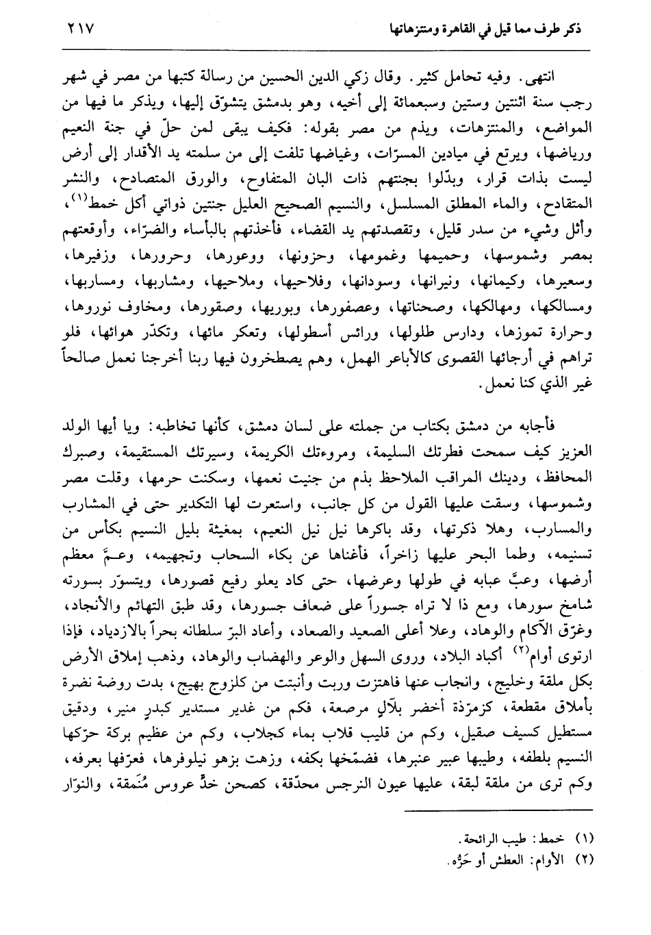 انتهى. وفيه تحامل كثير. وقال زكي الدين الحسين من رسالة كتبها من مصر في شهر رجب سنة اثنتين وستين وسبعمائة إلى أخيه، وهو بدمشق يتشوّق إليها، ويذكر ما فيها من المواضع، والمنتزهات، ويذم من مصر بقوله: فكيف يبقى لمن حلّ في جنة النعيم ورياضها، ويرتع في ميادين المسرّات، وغياضها تلفت إلى من سلمته يد الأقدار إلى أرض ليست بذات قرار، وبدّلوا بجنتهم ذات البان المتفاوح، والورق المتصادح، والنشر المتقادح، والماء المطلق المسلسل، والنسيم الصحيح العليل جنتين ذواتي أكل خمط «1» ، وأثل وشيء من سدر قليل، وتقصدتهم يد القضاء، فأخذتهم بالبأساء والضرّاء، وأوقعتهم بمصر وشموسها، وحميمها وغمومها، وحزونها، ووعورها، وحرورها، وزفيرها، وسعيرها، وكيمانها، ونيرانها، وسودانها، وفلاحيها، وملاحيها، ومشاربها، ومساربها، ومسالكها، ومهالكها، وصحناتها، وعصفورها، وبوريها، وصقورها، ومخاوف نوروها، وحرارة تموزها، ودارس طلولها، ورائس أسطولها، وتعكر مائها، وتكدّر هوائها، فلو تراهم في أرجائها القصوى كالأباعر الهمل، وهم يصطخرون فيها ربنا أخرجنا نعمل صالحا غير الذي كنا نعمل.