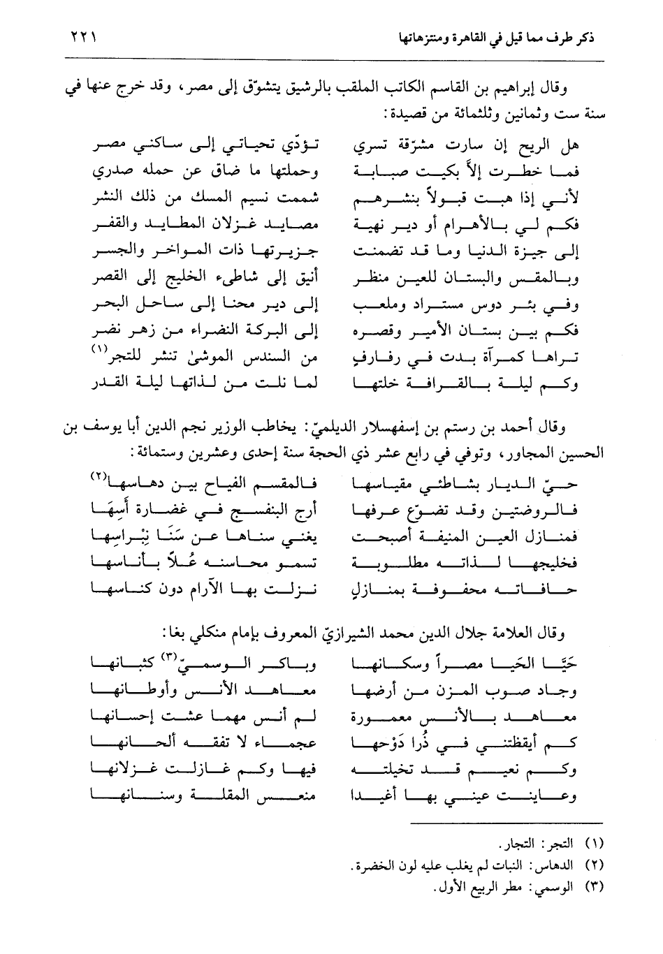 وقال إبراهيم بن القاسم الكاتب الملقب بالرشيق يتشوّق إلى مصر، وقد خرج عنها في سنة ست وثمانين وثلثمائة من قصيدة: