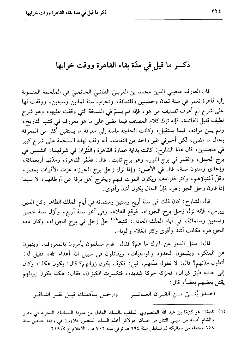 قال المعارف محيي الدين محمد بن العربيّ الطائيّ الحاتميّ في الملحمة المنسوبة إليه قاهرة تعمر في سنة ثمان وخمسين وثلثمائة، وتخرب سنة ثمانين وسبعين، ووقفت لها على شرح لم أعرف تصنيف من هو، فإنه لم يسمّ في النسخة التي وقفت عليها، وهو شرح لطيف قليل الفائدة، فإنه ترك كلام المصنف فيما مضى على ما هو معروف في كتب التاريخ، ولم يبين مراده، فيما يستقبل، وكانت الحاجة ماسة إلى معرفة ما يستقبل أكثر من المعرفة بحال ما مضى، لكن أخبرني غير واحد من الثقات، أنه وقف لهذه الملحمة على شرح كبير في مجلدين، قال هذا الشارح: كانت بداية عمارة القاهرة والنّيران في شرفهما: الشمس في برج الحمل، والقمر في برج الثور، وهو برج ثابت. قال: فعمّر القاهرة، ومدّتها أربعمائة، وإحدى وستون سنة، قال في الأصل: وإذا نزل زحل برج الجوزاء عزت الأقوات بمصر، وقلّ أغنياؤهم، وكثر فقراءهم ويكون الموت فيهم ويخرج أهل برقة عن أوطانهم، لا سيما إذا قارن زحل الجوزهر، فإنّ الحال يكون أشدّ وأقوى.