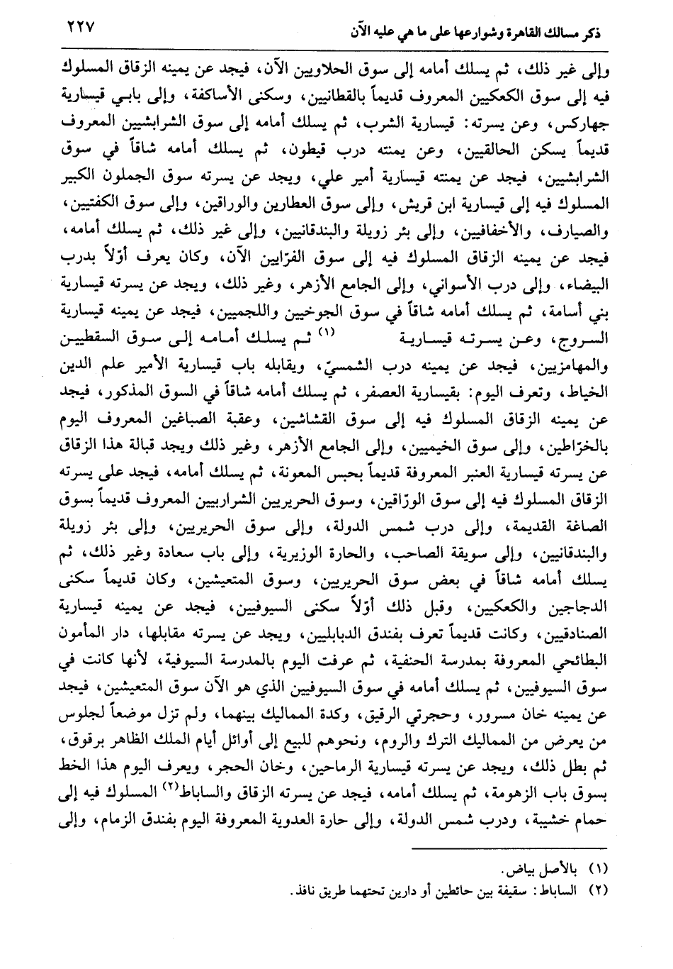 وإلى غير ذلك، ثم يسلك أمامه إلى سوق الحلاويين الآن، فيجد عن يمينه الزقاق المسلوك فيه إلى سوق الكعكيين المعروف قديما بالقطانيين، وسكنى الأساكفة، وإلى بابي قيسارية جهاركس، وعن يسرته: قيسارية الشرب، ثم يسلك أمامه إلى سوق الشرابشيين المعروف قديما يسكن الحالقيين، وعن يمنته درب قيطون، ثم يسلك أمامه شاقا في سوق الشرابشيين، فيجد عن يمنته قيسارية أمير علي، ويجد عن يسرته سوق الجملون الكبير المسلوك فيه إلى قيسارية ابن قريش، وإلى سوق العطارين والوراقين، وإلى سوق الكفتيين، والصيارف، والأخفافيين، وإلى بئر زويلة والبندقانيين، وإلى غير ذلك، ثم يسلك أمامه، فيجد عن يمينه الزقاق المسلوك فيه إلى سوق الفرّايين الآن، وكان يعرف أوّلا بدرب البيضاء، وإلى درب الأسواني، وإلى الجامع الأزهر، وغير ذلك، ويجد عن يسرته قيسارية بني أسامة، ثم يسلك أمامه شاقا في سوق الجوخيين واللجميين، فيجد عن يمينه قيسارية السروج، وعن يسرته قيسارية «1» ثم يسلك أمامه إلى سوق السقطيين والمهامزيين، فيجد عن يمينه درب الشمسيّ، ويقابله باب قيسارية الأمير علم الدين الخياط، وتعرف اليوم: بقيسارية العصفر، ثم يسلك أمامه شاقا في السوق المذكور، فيجد عن يمينه الزقاق المسلوك فيه إلى سوق القشاشين، وعقبة الصباغين المعروف اليوم بالخرّاطين، وإلى سوق الخيميين، وإلى الجامع الأزهر، وغير ذلك ويجد قبالة هذا الزقاق عن يسرته قيسارية العنبر المعروفة قديما بحبس المعونة، ثم يسلك أمامه، فيجد على يسرته الزقاق المسلوك فيه إلى سوق الورّاقين، وسوق الحريريين الشراربيين المعروف قديما بسوق الصاغة القديمة، وإلى درب شمس الدولة، وإلى سوق الحريريين، وإلى بئر زويلة والبندقانيين، وإلى سويقة الصاحب، والحارة الوزيرية، وإلى باب سعادة وغير ذلك، ثم يسلك أمامه شاقا في بعض سوق الحريريين، وسوق المتعيشين، وكان قديما سكنى الدجاجين والكعكيين، وقبل ذلك أوّلا سكنى السيوفيين، فيجد عن يمينه قيسارية الصنادقيين، وكانت قديما تعرف بفندق الدبابليين، ويجد عن يسرته مقابلها، دار المأمون البطائحي المعروفة بمدرسة الحنفية، ثم عرفت اليوم بالمدرسة السيوفية، لأنها كانت في سوق السيوفيين، ثم يسلك أمامه في سوق السيوفيين الذي هو الآن سوق المتعيشين، فيجد عن يمينه خان مسرور، وحجرتي الرقيق، وكدة المماليك بينهما، ولم تزل موضعا لجلوس من يعرض من المماليك الترك والروم، ونحوهم للبيع إلى أوائل أيام الملك الظاهر برقوق، ثم بطل ذلك، ويجد عن يسرته قيسارية الرماحين، وخان الحجر، ويعرف اليوم هذا الخط بسوق باب الزهومة، ثم يسلك أمامه، فيجد عن يسرته الزقاق والساباط «2» المسلوك فيه إلى حمام خشيبة، ودرب شمس الدولة، وإلى حارة العدوية المعروفة اليوم بفندق الزمام، وإلى