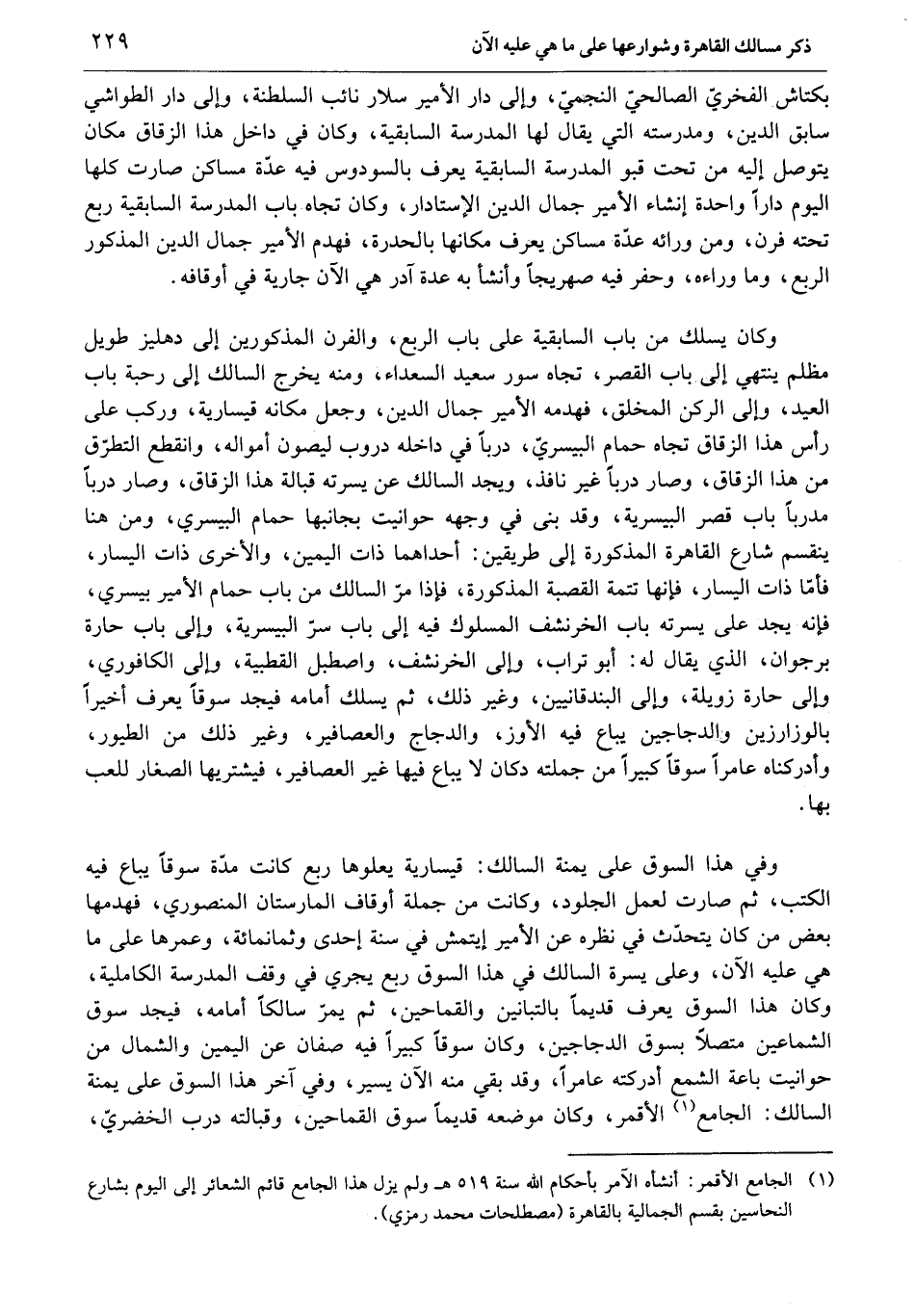 وفي هذا السوق على يمنة السالك: قيسارية يعلوها ربع كانت مدّة سوقا يباع فيه الكتب، ثم صارت لعمل الجلود، وكانت من جملة أوقاف المارستان المنصوري، فهدمها بعض من كان يتحدّث في نظره عن الأمير أيتمش في سنة إحدى وثمانمائة، وعمرها على ما هي عليه الآن، وعلى يسرة السالك في هذا السوق ربع يجري في وقف المدرسة الكاملية، وكان هذا السوق يعرف قديما بالتبانين والقماحين، ثم يمرّ سالكا أمامه، فيجد سوق الشماعين متصلا بسوق الدجاجين، وكان سوقا كبيرا فيه صفان عن اليمين والشمال من حوانيت باعة الشمع أدركته عامرا، وقد بقي منه الآن يسير، وفي آخر هذا السوق على يمنة السالك: الجامع «1» الأقمر، وكان موضعه قديما سوق القماحين، وقبالته درب الخضريّ،
