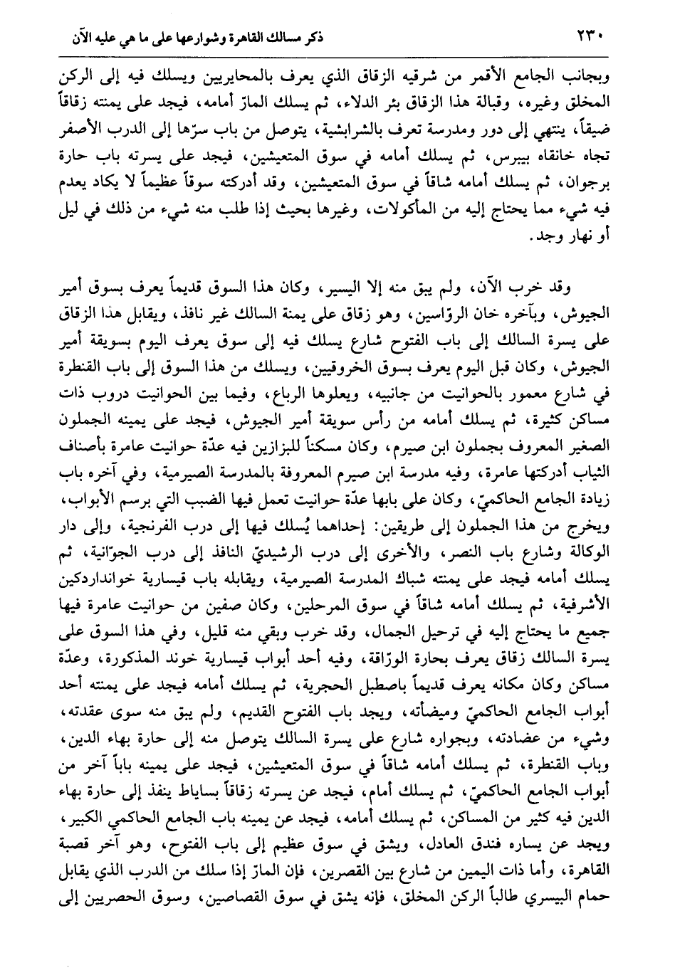وقد خرب الآن، ولم يبق منه إلا اليسير، وكان هذا السوق قديما يعرف بسوق أمير الجيوش، وبآخره خان الروّاسين، وهو زقاق على يمنة السالك غير نافذ، ويقابل هذا الزقاق على يسرة السالك إلى باب الفتوح شارع يسلك فيه إلى سوق يعرف اليوم بسويقة أمير الجيوش، وكان قبل اليوم يعرف بسوق الخروقيين، ويسلك من هذا السوق إلى باب القنطرة في شارع معمور بالحوانيت من جانبيه، ويعلوها الرباع، وفيما بين الحوانيت دروب ذات مساكن كثيرة، ثم يسلك أمامه من رأس سويقة أمير الجيوش، فيجد على يمينه الجملون الصغير المعروف بجملون ابن صيرم، وكان مسكنا للبزازين فيه عدّة حوانيت عامرة بأصناف الثياب أدركتها عامرة، وفيه مدرسة ابن صيرم المعروفة بالمدرسة الصيرمية، وفي آخره باب زيادة الجامع الحاكميّ، وكان على بابها عدّة حوانيت تعمل فيها الضبب التي برسم الأبواب، ويخرج من هذا الجملون إلى طريقين: إحداهما يسلك فيها إلى درب الفرنجية، وإلى دار الوكالة وشارع باب النصر، والأخرى إلى درب الرشيديّ النافذ إلى درب الجوّانية، ثم يسلك أمامه فيجد على يمنته شباك المدرسة الصيرمية، ويقابله باب قيسارية خوانداردكين الأشرفية، ثم يسلك أمامه شاقا في سوق المرحلين، وكان صفين من حوانيت عامرة فيها جميع ما يحتاج إليه في ترحيل الجمال، وقد خرب وبقي منه قليل، وفي هذا السوق على يسرة السالك زقاق يعرف بحارة الورّاقة، وفيه أحد أبواب قيسارية خوند المذكورة، وعدّة مساكن وكان مكانه يعرف قديما باصطبل الحجرية، ثم يسلك أمامه فيجد على يمنته أحد أبواب الجامع الحاكميّ وميضأته، ويجد باب الفتوح القديم، ولم يبق منه سوى عقدته، وشيء من عضادته، وبجواره شارع على يسرة السالك يتوصل منه إلى حارة بهاء الدين، وباب القنطرة، ثم يسلك أمامه شاقا في سوق المتعيشين، فيجد على يمينه بابا آخر من أبواب الجامع الحاكميّ، ثم يسلك أمام، فيجد عن يسرته زقاقا بساياط ينفذ إلى حارة بهاء الدين فيه كثير من المساكن، ثم يسلك أمامه، فيجد عن يمينه باب الجامع الحاكمي الكبير، ويجد عن يساره فندق العادل، ويشق في سوق عظيم إلى باب الفتوح، وهو آخر قصبة القاهرة، وأما ذات اليمين من شارع بين القصرين، فإن المارّ إذا سلك من الدرب الذي يقابل حمام البيسري طالبا الركن المخلق، فإنه يشق في سوق القصاصين، وسوق الحصريين إلى