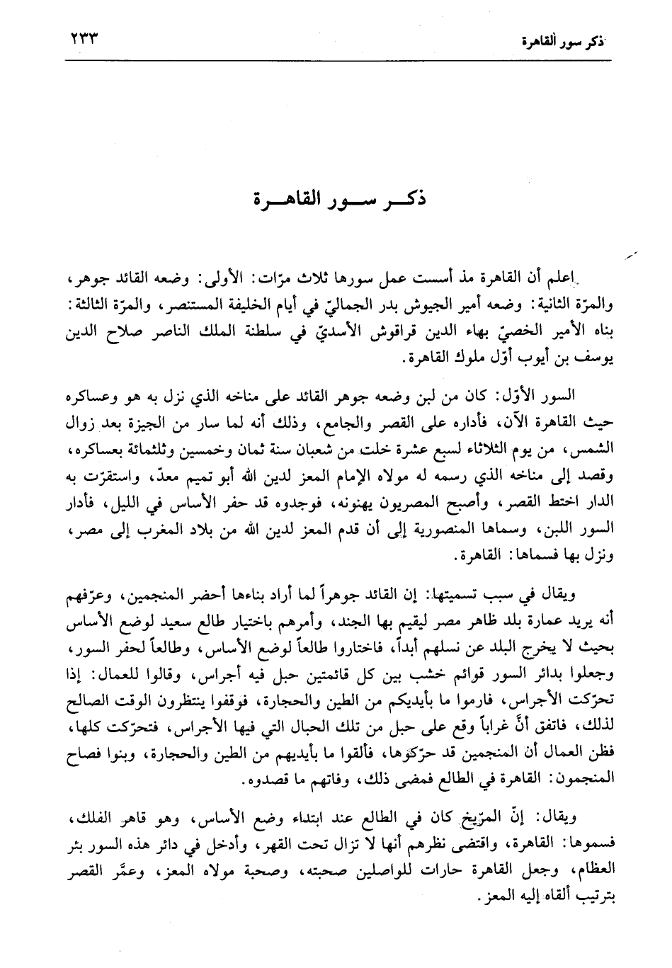 اعلم أن القاهرة مذ أسست عمل سورها ثلاث مرّات: الأولى: وضعه القائد جوهر، والمرّة الثانية: وضعه أمير الجيوش بدر الجماليّ في أيام الخليفة المستنصر، والمرّة الثالثة: