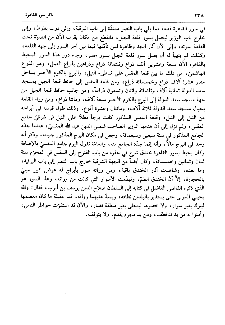 في سور القاهرة قطعة مما يلي باب النصر ممتدّة إلى باب البرقية، وإلى درب بطوط، وإلى خارج باب الوزير ليتصل بسور قلعة الجبل، فانقطع من مكان يقرب الآن من الصوّة تحت القلعة لموته، وإلى الآن آثار الجد وظاهرة لمن تأمّلها فيما بين آخر السور إلى جهة القلعة، وكذلك لم يتهيأ له أن يصل سور قلعة الجبل بسور مصر، وجاء دور هذا السور المحيط بالقاهرة الآن تسعة وعشرين ألف ذراع وثلثمائة ذراع وذراعين بذراع العمل، وهو الذراع الهاشميّ، من ذلك ما بين قلعة المقس على شاطىء النيل، والبرج بالكوم الأحمر بساحل مصر عشرة آلاف ذراع وخمسمائة ذراع، ومن قلعة المقس إلى حائط قلعة الجبل بمسجد سعد الدولة ثمانية آلاف وثلثمائة واثنان وتسعون ذراعا، ومن جانب حائط قلعة الجبل من جهة مسجد سعد الدولة إلى البرج بالكوم الأحمر سبعة آلاف، ومائتا ذراع، ومن وراء القلعة بحيال مسجد سعد الدولة ثلاثة آلاف، ومائتان وعشرة أذرع، وذلك طول قوسه في أبراجه من النيل إلى النيل، وقلعة المقس المذكور كانت برجا مطلا على النيل في شرقيّ جامع المقس، ولم تزل إلى أن هدمها الوزير الصاحب شمس الدين عبد الله المقسيّ، عندما جدّد الجامع المذكور في سنة سبعين وسبعمائة، وجعل في مكان البرج المذكور جنينته، وذكر أنه وجد في البرج مالا، وأنه إنما جدّد الجامع منه، والعامّة تقول اليوم جام المقسيّ بالإضافة وكان يحيط بسور القاهرة خندق شرع في حفره من باب الفتوح إلى المقس في المحرّم سنة ثمان وثمانين وخمسمائة، وكان أيضا من الجهة الشرقية خارج باب النصر إلى باب البرقية، وما بعده، وشاهدت آثار الخندق باقية، ومن ورائه سور بأبراج له عرض كبير مبنيّ بالحجارة، إلّا أنّ الخندق انطمّ، وتهدّمت الأسوار التي كانت من ورائه، وهذا السور هو الذي ذكره القاضي الفاضل في كتابه إلى السلطان صلاح الدين يوسف بن أيوب، فقال: والله يحيي المولى حتى يستدير بالبلدين نطاقه، ويمتدّ عليهما رواقه، فما عقيلة ما كان معصمها ليترك بغير سوار، ولا خصرها ليتحلى بغير منطقة تضار، والآن قد استقرّت خواطر الناس، وأمنوا به من يد تتخطف، ومن يد مجرم يقدم، ولا يتوقف.