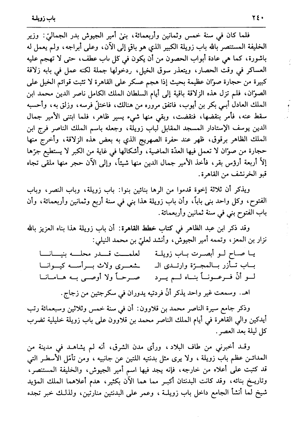 وقد أخبرني من طاف البلاد، ورأى مدن الشرق، أنه لم يشاهد في مدينة من المدائن عظم باب زويلة، ولا يرى مثل بدنتيه اللتين عن جانبيه، ومن تأمّل الأسطر التي قد كتبت على أعلاه من خارجه، فإنه يجد فيها اسم أمير الجيوش، والخليفة المستنصر، وتاريخ بنائه، وقد كانت البدنتان أكبر مما هما الآن بكثير، هدم أعلاهما الملك المؤيد شيخ لما أنشأ الجامع داخل باب زويلة، وعمر على البدنتين منارتين، ولذلك خبر تجده
