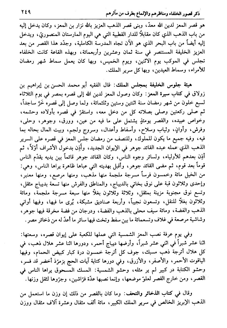 هيئة جلوس الخليفة بمجلس الملك: قال الفقيه أبو محمد الحسن بن إبراهيم بن زولاق في كتاب سيرة المعز: وكان وصول المعز لدين الله إلى قصره بمصر في يوم الثلاثاء لسبع خلون من شهر رمضان سنة اثنتين وستين وثلثمائة، ولما وصل إلى قصره خرّ ساجدا، ثم صلى ركعتين وصلى بصلاته كل من دخل معه، واستقرّ في قصره بأولاده وحشمه، وخواص عبيده، والقصر يومئذ يشتمل على ما فيه من عين، وورق، وجوهر، وحلى، وفرش، وأوان، وثياب وسلاح، وأسفاط وأعدال، وسروج ولجم، وبيت المال بحاله بما فيه، وفيه جميع ما يكون للملوك، وللنصف من رمضان جلس المعجز في قصره على السرير الذهب الذي عمله عبده القائد جوهر في الإيوان الجديد، وأذن بدخول الأشراف أوّلا، ثم أذن بعدهم للأولياء، ولسائر وجوه الناس، وكان القائد جوهر قائما بين يديه يقدّم الناس قوما بعد قوم، ثم مضى القائد جوهر، وأقبل بهديته التي عباها ظاهرة يراها الناس، وهي: