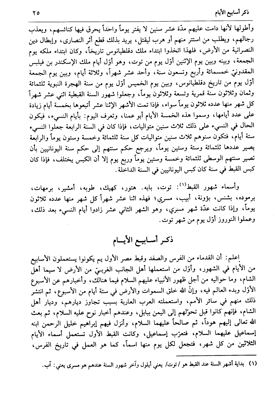 إعلم: أن القدماء من الفرس والصفد وقبط مصر الأول يم يكونوا يستعملون الأسابيع من الأيام في الشهور، وأوّل من استعملها أهل الجانب الغربيّ من الأرض لا سيما أهل الشام، وما حواليه من أجل ظهور الأنبياء عليهم السلام فيما هنا لك، وأخبارهم عن الأسبوع الأوّل وبدء العالم فيه، وإنّ الله خلق السماوات والأرض في ستة أيام من الأسبوع، ثم انتشر ذلك منهم في سائر الأمم، واستعملته العرب العاربة بسبب تجاوز ديارهم، وديار أهل الشام، فإنهم كانوا قبل تحوّلهم إلى اليمن ببابل، وعندهم أخبار نوح عليه السلام، ثم بعث الله تعالى إليهم هودا، ثم صالحا عليهما السلام، وأنزل فيهم إبراهيم خليل الرحمن ابنه إسماعيل عليهما السلام، فتعرّب إسماعيل، وكانت القبط الأول تستعمل أسماء الأيام الثلاثين من كل شهر، فتجعل لكل يوم منها اسما، كما هو العمل في تاريخ الفرس،