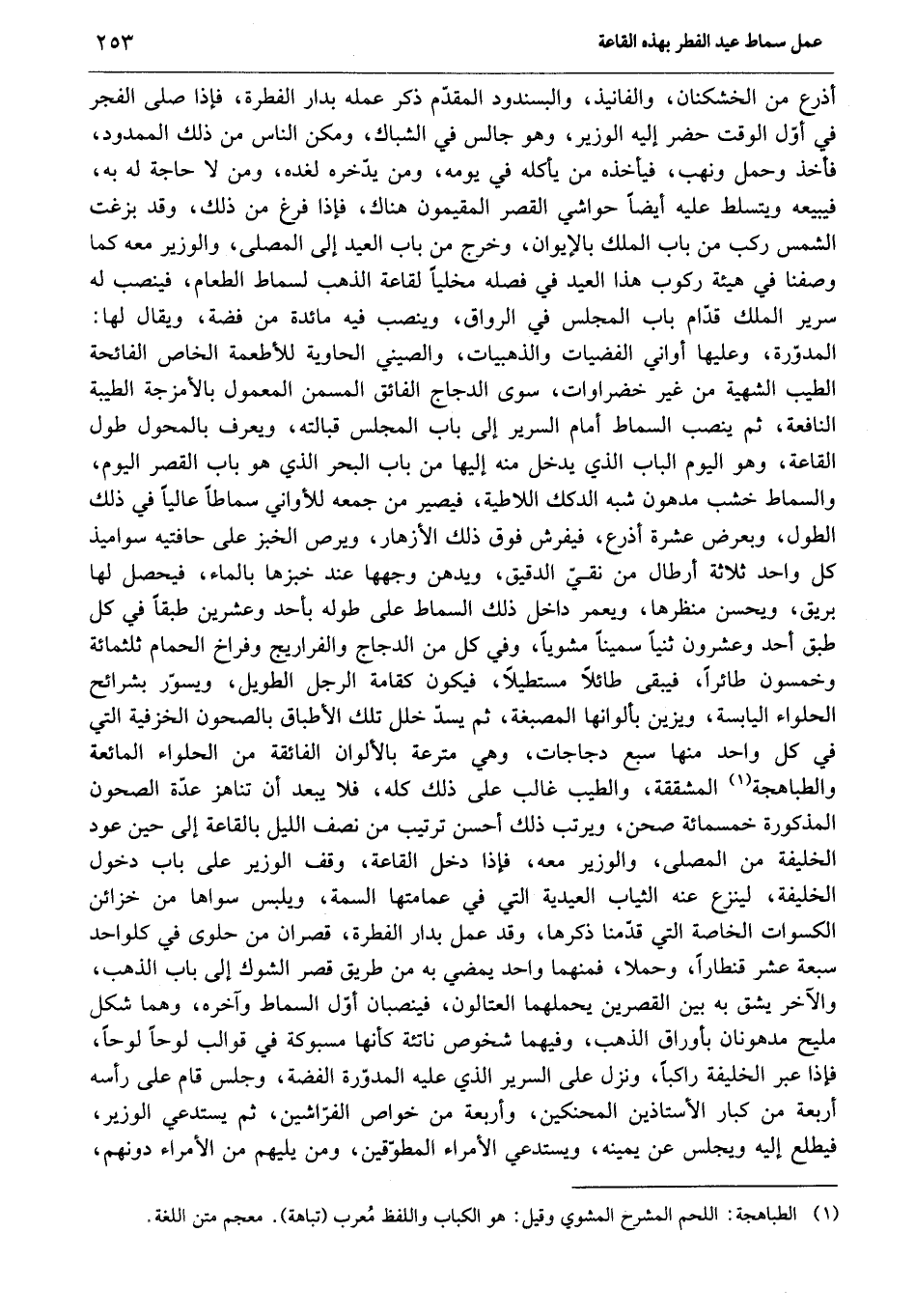 المدوّرة، وعليها أواني الفضيات والذهبيات، والصيني الحاوية للأطعمة الخاص الفائحة الطيب الشهية من غير خضراوات، سوى الدجاج الفائق المسمن المعمول بالأمزجة الطيبة النافعة، ثم ينصب السماط أمام السرير إلى باب المجلس قبالته، ويعرف بالمحول طول القاعة، وهو اليوم الباب الذي يدخل منه إليها من باب البحر الذي هو باب القصر اليوم، والسماط خشب مدهون شبه الدكك اللاطية، فيصير من جمعه للأواني سماطا عاليا في ذلك الطول، وبعرض عشرة أذرع، فيفرش فوق ذلك الأزهار، ويرص الخبز على حافتيه سواميذ كل واحد ثلاثة أرطال من نقيّ الدقيق، ويدهن وجهها عند خبزها بالماء، فيحصل لها بريق، ويحسن منظرها، ويعمر داخل ذلك السماط على طوله بأحد وعشرين طبقا في كل طبق أحد وعشرون ثنيا سمينا مشويا، وفي كل من الدجاج والفراريج وفراخ الحمام ثلثمائة وخمسون طائرا، فيبقى طائلا مستطيلا، فيكون كقامة الرجل الطويل، ويسوّر بشرائح الحلواء اليابسة، ويزين بألوانها المصبغة، ثم يسدّ خلل تلك الأطباق بالصحون الخزفية التي في كل واحد منها سبع دجاجات، وهي مترعة بالألوان الفائقة من الحلواء المائعة والطباهجة «1» المشققة، والطيب غالب على ذلك كله، فلا يبعد أن تناهز عدّة الصحون المذكورة خمسمائة صحن، ويرتب ذلك أحسن ترتيب من نصف الليل بالقاعة إلى حين عود الخليفة من المصلى، والوزير معه، فإذا دخل القاعة، وقف الوزير على باب دخول الخليفة، لينزع عنه الثياب العيدية التي في عمامتها السمة، ويلبس سواها من خزائن الكسوات الخاصة التي قدّمنا ذكرها، وقد عمل بدار الفطرة، قصران من حلى في كلواحد سبعة عشر قنطارا، وحملا، فمنهما واحد يمضي به من طريق قصر الشوك إلى باب الذهب، والآخر يشق به بين القصرين يحملهما العتالون، فينصبان أوّل السماط وآخره، وهما شكل مليح مدهونان بأوراق الذهب، وفيهما شخوص ناتئة كأنها مسبوكة في قوالب لوحا لوحا، فإذا عبر الخليفة راكبا، ونزل على السرير الذي عليه المدوّرة الفضة، وجلس قام على رأسه أربعة من كبار الأستاذين المحنكين، وأربعة من خواص الفرّاشين، ثم يستدعي الوزير، فيطلع إليه ويجلس عن يمينه، ويستدعي الأمراء المطوّقين، ومن يليهم من الأمراء دونهم،