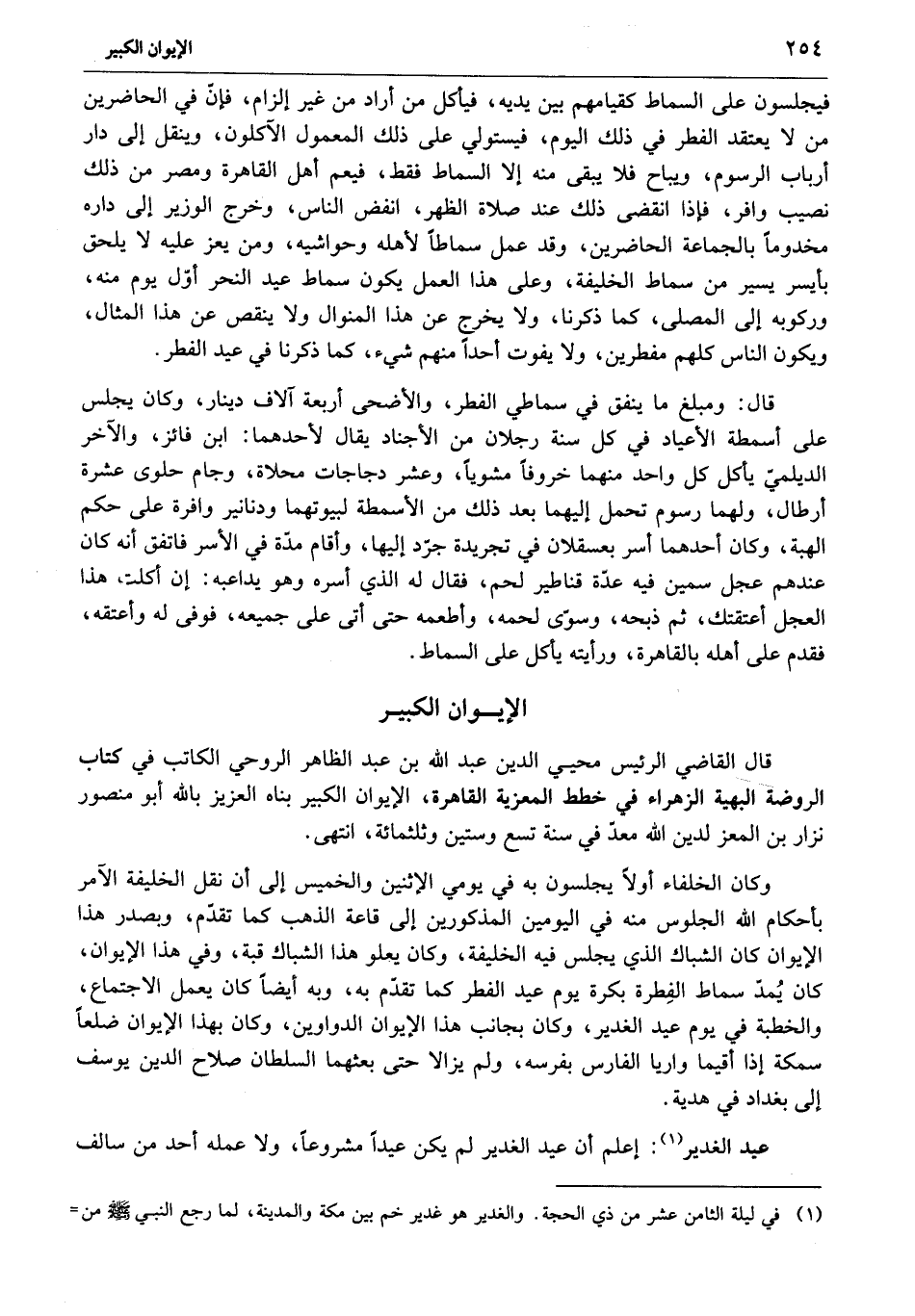 فيجلسون على السماط كقيامهم بين يديه، فيأكل من أراد من غير إلزام، فإنّ في الحاضرين من لا يعتقد الفطر في ذلك اليوم، فيستولي على ذلك المعمول الآكلون، وينقل إلى دار أرباب الرسوم، ويباح فلا يبقى منه إلا السماط فقط، فيعم أهل القاهرة ومصر من ذلك نصيب وافر، فإذا انقضى ذلك عند صلاة الظهر، انفض الناس، وخرج الوزير إلى داره مخدوما بالجماعة الحاضرين، وقد عمل سماطا لأهله وحواشيه، ومن يعز عليه لا يلحق بأيسر يسير من سماط الخليفة، وعلى هذا العمل يكون سماط عيد النحر أوّل يوم منه، وركوبه إلى المصلى، كما ذكرنا، ولا يخرج عن هذا المنوال ولا ينقص عن هذا المثال، ويكون الناس كلهم مفطرين، ولا يفوت أحدا منهم شيء، كما ذكرنا في عيد الفطر.