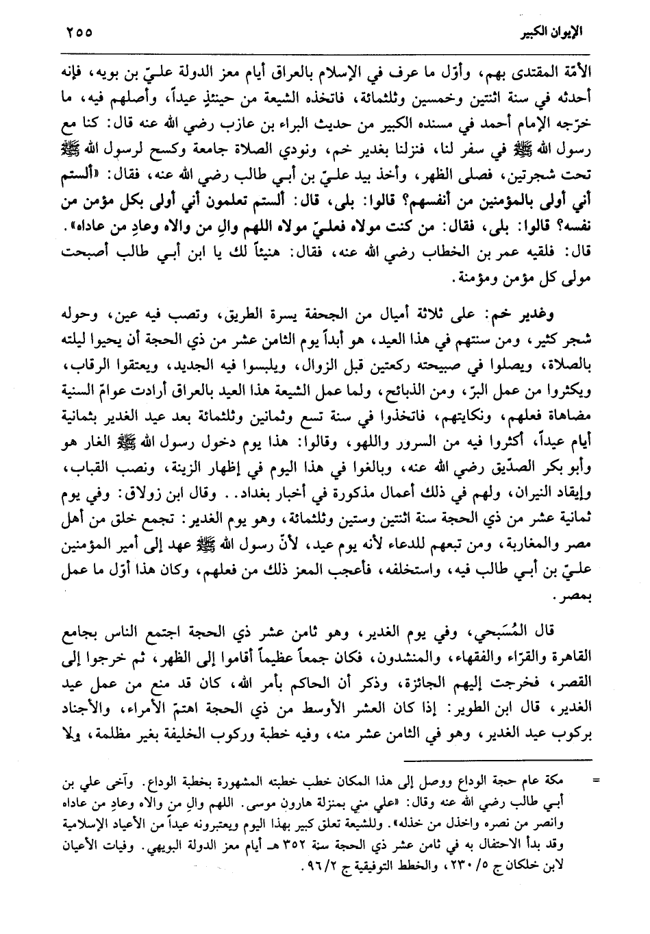 الأمّة المقتدى بهم، وأوّل ما عرف في الإسلام بالعراق أيام معز الدولة عليّ بن بويه، فإنه أحدثه في سنة اثنتين وخمسين وثلثمائة، فاتخذه الشيعة من حينئذ عيدا، وأصلهم فيه، ما خرّجه الإمام أحمد في مسنده الكبير من حديث البراء بن عازب رضي الله عنه قال: كنا مع رسول الله صلّى الله عليه وسلّم في سفر لنا، فنزلنا بغدير خم، ونودي الصلاة جامعة وكسح لرسول الله صلّى الله عليه وسلّم تحت شجرتين، فصلى الظهر، وأخذ بيد عليّ بن أبي طالب رضي الله عنه، فقال: «ألستم أني أولى بالمؤمنين من أنفسهم؟ قالوا: بلى، قال: ألستم تعلمون أني أولى بكل مؤمن من نفسه؟ قالوا: بلى، فقال: من كنت مولاه فعليّ مولاه اللهم وال من والاه وعاد من عاداه» .