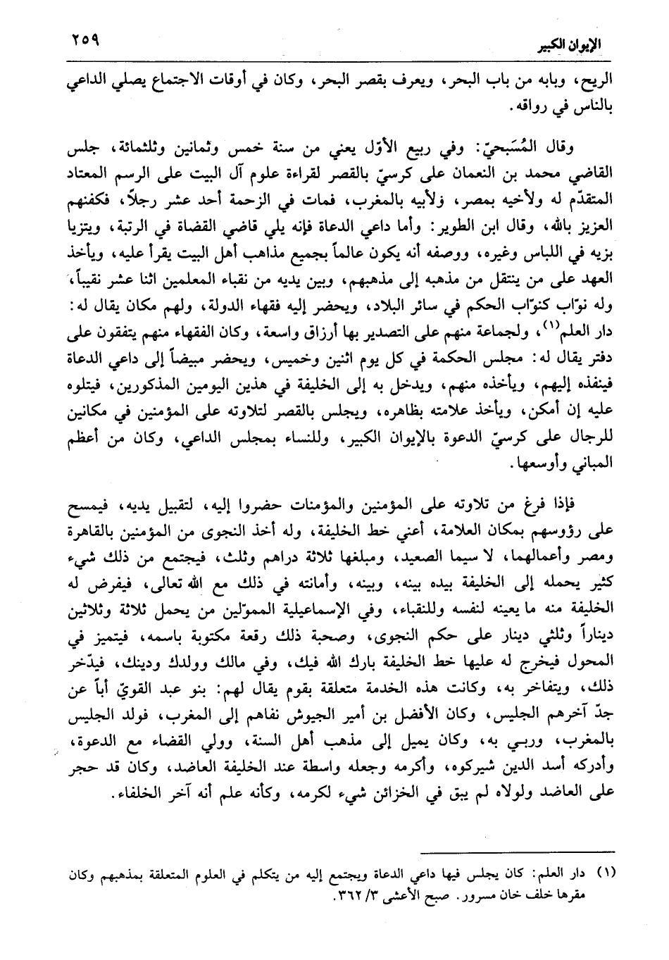 دار العلم «1» ، ولجماعة منهم على التصدير بها أرزاق واسعة، وكان الفقهاء منهم يتفقون على دفتر يقال له: مجلس الحكمة في كل يوم اثنين وخميس، ويحضر مبيضا إلى داعي الدعاة فينفذه إليهم، ويأخذه منهم، ويدخل به إلى الخليفة في هذين اليومين المذكورين، فيتلوه عليه إن أمكن، ويأخذ علامته بظاهره، ويجلس بالقصر لتلاوته على المؤمنين في مكانين للرجال على كرسيّ الدعوة بالإيوان الكبير، وللنساء بمجلس الداعي، وكان من أعظم المباني وأوسعها.
