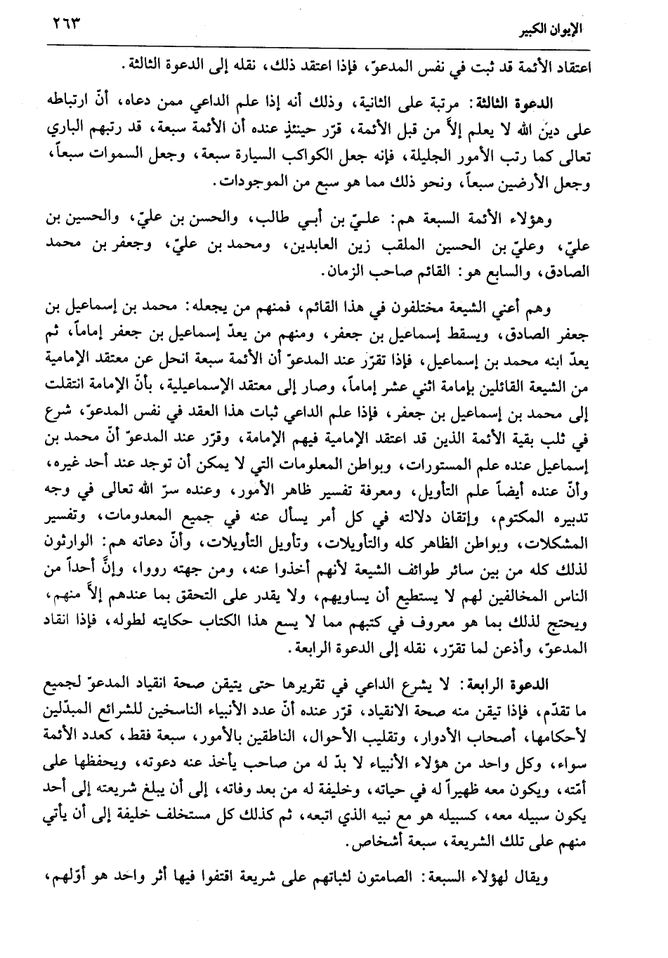 وهم أعني الشيعة مختلفون في هذا القائم، فمنهم من يجعله: محمد بن إسماعيل بن جعفر الصادق، ويسقط إسماعيل بن جعفر، ومنهم من يعدّ إسماعيل بن جعفر إماما، ثم يعدّ ابنه محمد بن إسماعيل، فإذا تقرّر عند المدعوّ أن الأئمة سبعة انحل عن معتقد الإمامية من الشيعة القائلين بإمامة اثني عشر إماما، وصار إلى معتقد الإسماعيلية، بأنّ الإمامة انتقلت إلى محمد بن إسماعيل بن جعفر، فإذا علم الداعي ثبات هذا العقد في نفس المدعوّ، شرع في ثلب بقية الأئمة الذين قد اعتقد الإمامية فيهم الإمامة، وقرّر عند المدعوّ أنّ محمد بن إسماعيل عنده علم المستورات، وبواطن المعلومات التي لا يمكن أن توجد عند أحد غيره، وأنّ عنده أيضا علم التأويل، ومعرفة تفسير ظاهر الأمور، وعنده سرّ الله تعالى في وجه تدبيره المكتوم، وإتقان دلالته في كل أمر يسأل عنه في جميع المعدومات، وتفسير المشكلات، وبواطن الظاهر كله والتأويلات، وتأويل التأويلات، وأنّ دعاته هم: الوارثون لذلك كله من بين سائر طوائف الشيعة لأنهم أخذوا عنه، ومن جهته رووا، وإنّ أحدا من الناس المخالفين لهم لا يستطيع أن يساويهم، ولا يقدر على التحقق بما عندهم إلّا منهم، ويحتج لذلك بما هو معروف في كتبهم مما لا يسع هذا الكتاب حكايته لطوله، فإذا انقاد المدعوّ، وأذعن لما تقرّر، نقله إلى الدعوة الرابعة.