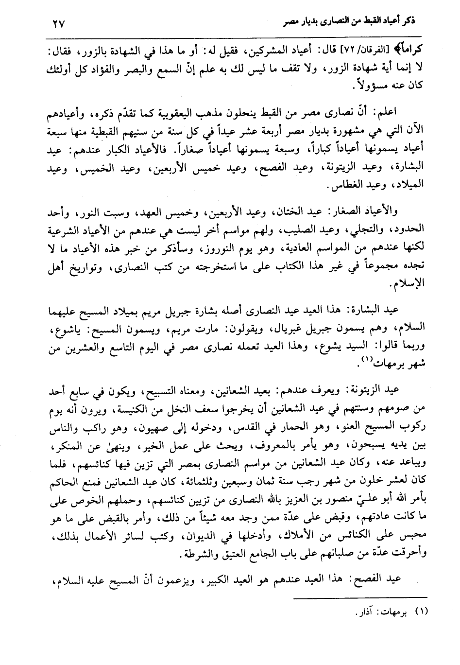 عيد البشارة: هذا العيد عيد النصارى أصله بشارة جبريل مريم بميلاد المسيح عليهما السلام، وهم يسمون جبريل غبريال، ويقولون: مارت مريم، ويسمون المسيح: ياشوع، وربما قالوا: السيد يشوع، وهذا العيد تعمله نصارى مصر في اليوم التاسع والعشرين من شهر برمهات «1» .