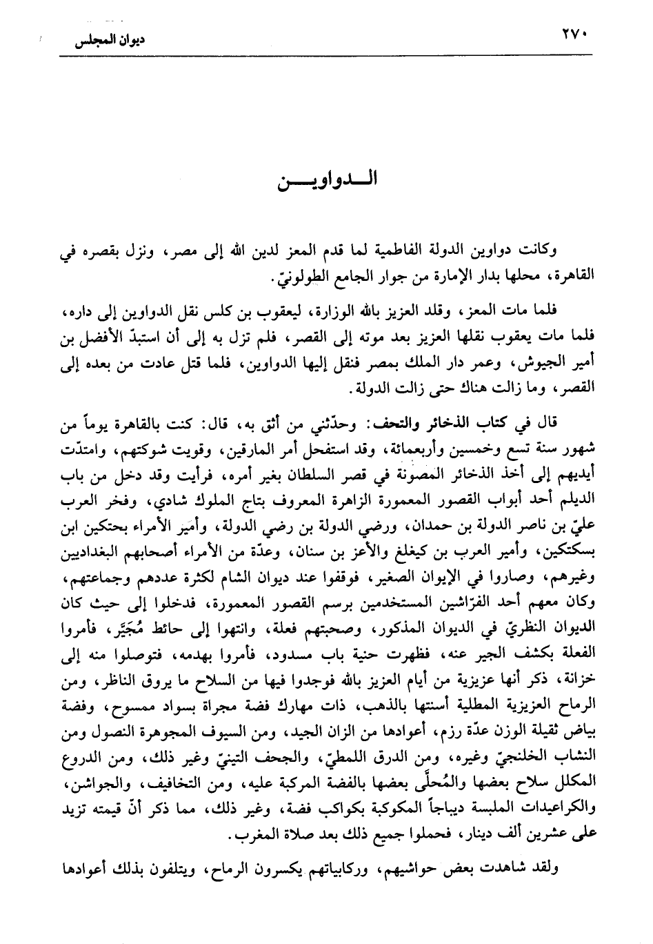 قال في كتاب الذخائر والتحف: وحدّثني من أثق به، قال: كنت بالقاهرة يوما من شهور سنة تسع وخمسين وأربعمائة، وقد استفحل أمر المارقين، وقويت شوكتهم، وامتدّت أيديهم إلى أخذ الذخائر المصونة في قصر السلطان بغير أمره، فرأيت وقد دخل من باب الديلم أحد أبواب القصور المعمورة الزاهرة المعروف بتاج الملوك شادي، وفخر العرب عليّ بن ناصر الدولة بن حمدان، ورضي الدولة بن رضي الدولة، وأمير الأمراء بحتكين ابن بسكتكين، وأمير العرب بن كيغلغ والأعز بن سنان، وعدّة من الأمراء أصحابهم البغداديين وغيرهم، وصاروا في الإيوان الصغير، فوقفوا عند ديوان الشام لكثرة عددهم وجماعتهم، وكان معهم أحد الفرّاشين المستخدمين برسم القصور المعمورة، فدخلوا إلى حيث كان الديوان النظريّ في الديوان المذكور، وصحبتهم فعلة، وانتهوا إلى حائط مجيّر، فأمروا الفعلة بكشف الجير عنه، فظهرت حنية باب مسدود، فأمروا بهدمه، فتوصلوا منه إلى خزانة، ذكر أنها عزيزية من أيام العزيز بالله فوجدوا فيها من السلاح ما يروق الناظر، ومن الرماح العزيزية المطلية أسنتها بالذهب، ذات مهارك فضة مجراة بسواد ممسوح، وفضة بياض ثقيلة الوزن عدّة رزم، أعوادها من الزان الجيد، ومن السيوف المجوهرة النصول ومن النشاب الخلنجيّ وغيره، ومن الدرق اللمطيّ، والجحف التينيّ وغير ذلك، ومن الدروع المكلل سلاح بعضها والمحلّى بعضها بالفضة المركبة عليه، ومن التخافيف، والجواشن، والكراعيدات الملبسة ديباجا المكوكبة بكواكب فضة، وغير ذلك، مما ذكر أنّ قيمته تزيد على عشرين ألف دينار، فحملوا جميع ذلك بعد صلاة المغرب.