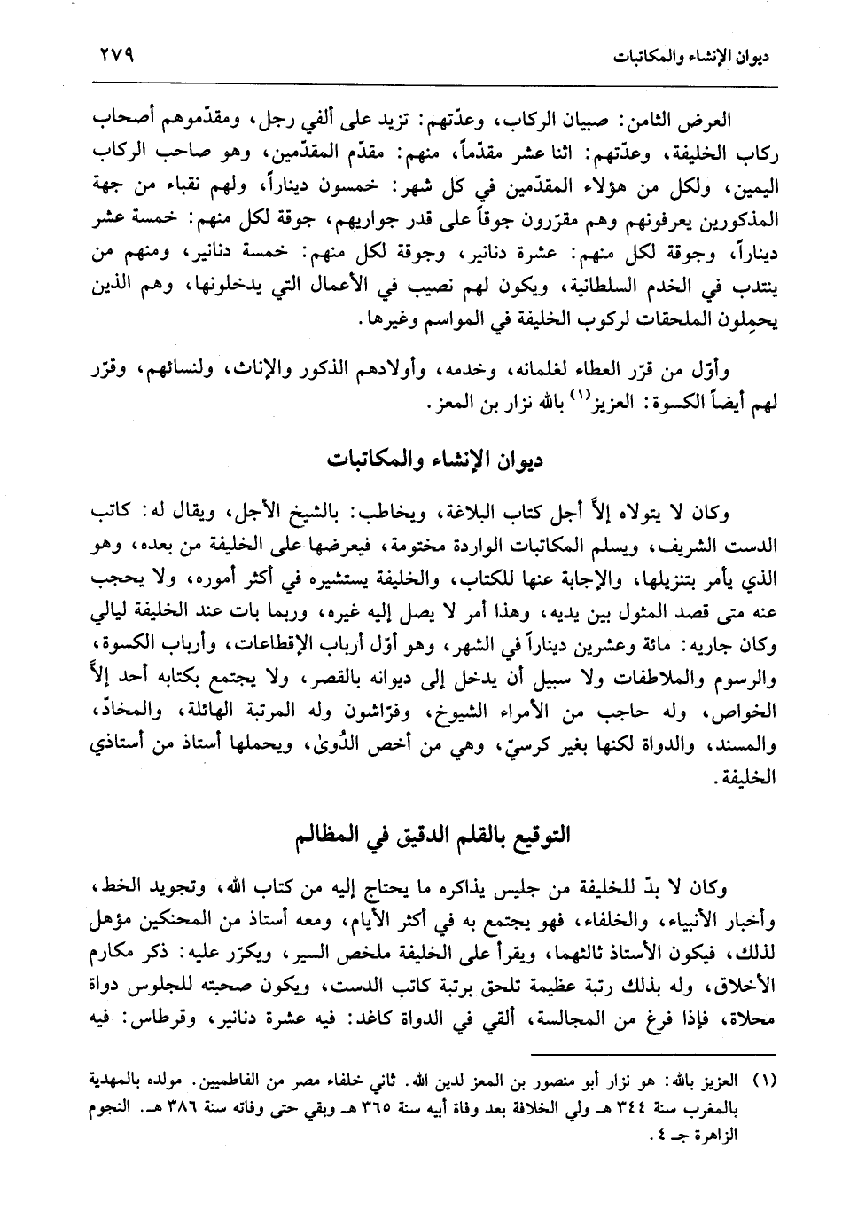 وأوّل من قرّر العطاء لغلمانه، وخدمه، وأولادهم الذكور والإناث، ولنسائهم، وقرّر لهم أيضا الكسوة: العزيز «1» بالله نزار بن المعز.