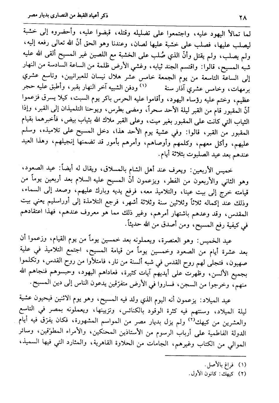 عيد الميلاد: يزعمون أنه اليوم الذي ولد فيه المسيح، وهو يوم الاثنين فيحيون عشية ليلة الميلاد، وسنتهم فيه كثرة الوقود بالكنائس، وتزيينها، ويعملونه بمصر في التاسع والعشرين من كيهك «2» ولم يزل بديار مصر من المواسم المشهورة، فكان يفرّق فيه أيام الدولة الفاطمية على أرباب الرسوم من الأستاذين المحنكين، والأمراء المطوّقين، وسائر الموالي من الكتاب وغيرهم، الجامات من الحلاوة القاهرية، والمثارد التي فيها السميذ،