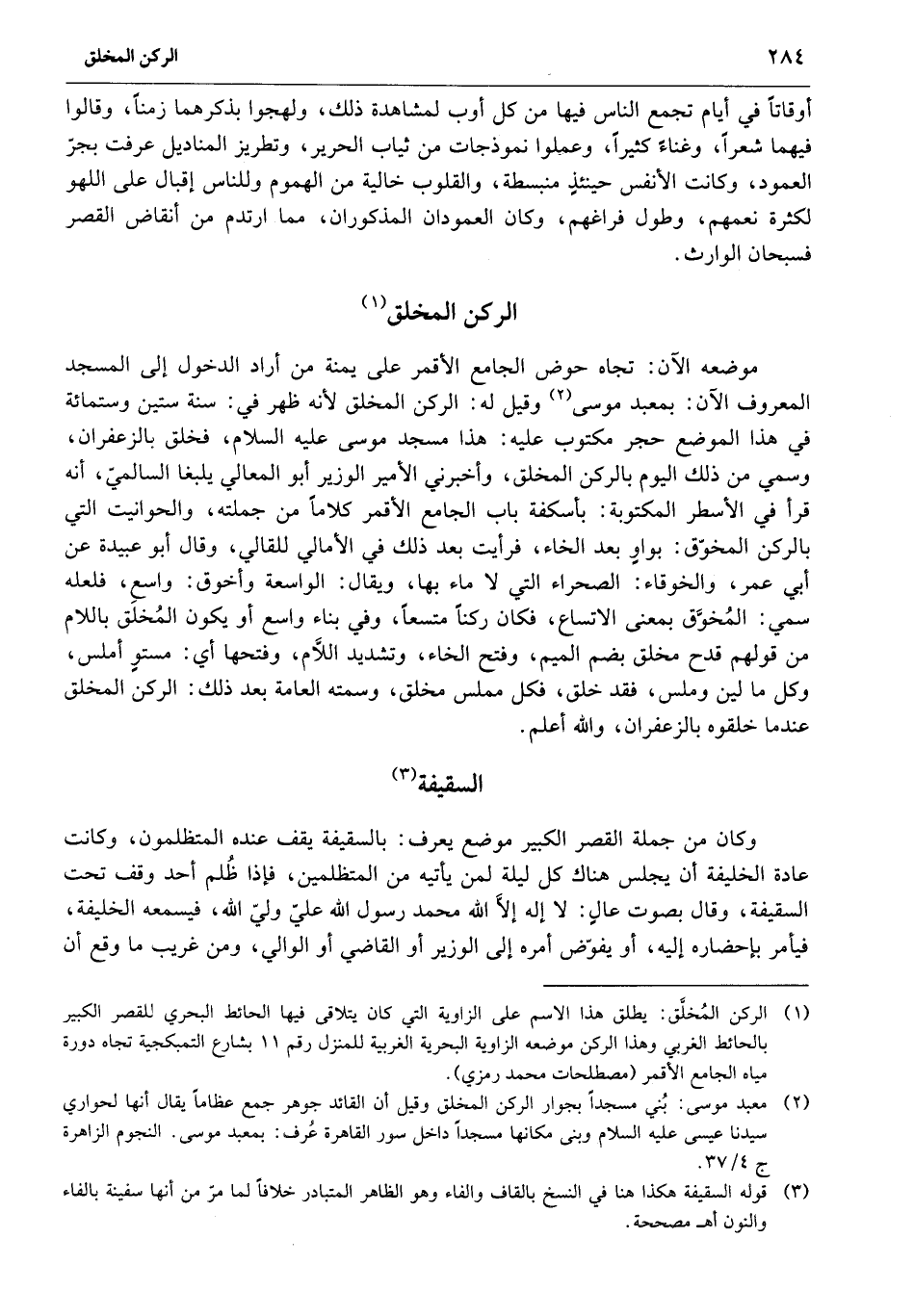 موضعه الآن: تجاه حوض الجامع الأقمر على يمنة من أراد الدخول إلى المسجد المعروف الآن: بمعبد موسى «2» وقيل له: الركن المخلق لأنه ظهر في: سنة ستين وستمائة في هذا الموضع حجر مكتوب عليه: هذا مسجد موسى عليه السلام، فخلق بالزعفران، وسمي من ذلك اليوم بالركن المخلق، وأخبرني الأمير الوزير أبو المعالي يلبغا السالميّ، أنه قرأ في الأسطر المكتوبة: بأسكفة باب الجامع الأقمر كلاما من جملته، والحوانيت التي بالركن المخوّق: بواو بعد الخاء، فرأيت بعد ذلك في الأمالي للقالي، وقال أبو عبيدة عن أبي عمر، والخوقاء: الصحراء التي لا ماء بها، ويقال: الواسعة وأخوق: واسع، فلعله سمي: المخوّق بمعنى الاتساع، فكان ركنا متسعا، وفي بناء واسع أو يكون المخلق باللام من قولهم قدح مخلق بضم الميم، وفتح الخاء، وتشديد اللّام، وفتحها أي: مستو أملس، وكل ما لين وملس، فقد خلق، فكل مملس مخلق، وسمته العامة بعد ذلك: الركن المخلق عندما خلقوه بالزعفران، والله أعلم.