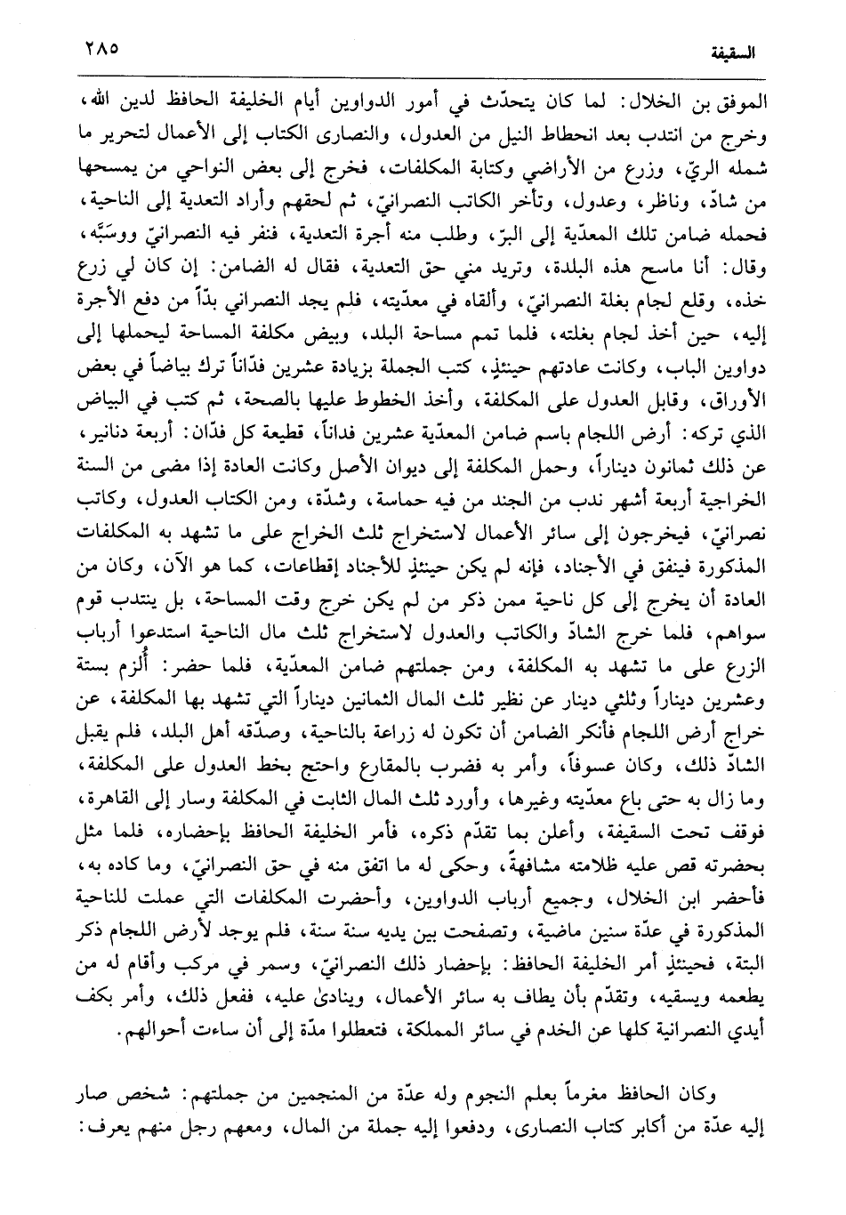 الموفق بن الخلال: لما كان يتحدّث في أمور الدواوين أيام الخليفة الحافظ لدين الله، وخرج من انتدب بعد انحطاط النيل من العدول، والنصارى الكتاب إلى الأعمال لتحرير ما شمله الريّ، وزرع من الأراضي وكتابة المكلفات، فخرج إلى بعض النواحي من يمسحها من شادّ، وناظر، وعدول، وتأخر الكاتب النصرانيّ، ثم لحقهم وأراد التعدية إلى الناحية، فحمله ضامن تلك المعدّية إلى البرّ، وطلب منه أجرة التعدية، فنفر فيه النصرانيّ ووسبّه، وقال: أنا ماسح هذه البلدة، وتريد مني حق التعدية، فقال له الضامن: إن كان لي زرع خذه، وقلع لجام بغلة النصرانيّ، وألقاه في معدّيته، فلم يجد النصراني بدّا من دفع الأجرة إليه، حين أخذ لجام بغلته، فلما تمم مساحة البلد، وبيض مكلفة المساحة ليحملها إلى دواوين الباب، وكانت عادتهم حينئذ، كتب الجملة بزيادة عشرين فدّانا ترك بياضا في بعض الأوراق، وقابل العدول على المكلفة، وأخذ الخطوط عليها بالصحة، ثم كتب في البياض الذي تركه: أرض اللجام باسم ضامن المعدّية عشرين فدانا، قطيعة كل فدّان: أربعة دنانير، عن ذلك ثمانون دينارا، وحمل المكلفة إلى ديوان الأصل وكانت العادة إذا مضى من السنة الخراجية أربعة أشهر ندب من الجند من فيه حماسة، وشدّة، ومن الكتاب العدول، وكاتب نصرانيّ، فيخرجون إلى سائر الأعمال لاستخراج ثلث الخراج على ما تشهد به المكلفات المذكورة فينفق في الأجناد، فإنه لم يكن حينئذ للأجناد إقطاعات، كما هو الآن، وكان من العادة أن يخرج إلى كل ناحية ممن ذكر من لم يكن خرج وقت المساحة، بل ينتدب قوم سواهم، فلما خرج الشادّ والكاتب والعدول لاستخراج ثلث مال الناحية استدعوا أرباب الزرع على ما تشهد به المكلفة، ومن جملتهم ضامن المعدّية، فلما حضر: ألزم بستة وعشرين دينارا وثلثي دينار عن نظير ثلث المال الثمانين دينارا التي تشهد بها المكلفة، عن خراج أرض اللجام فأنكر الضامن أن تكون له زراعة بالناحية، وصدّقه أهل البلد، فلم يقبل الشادّ ذلك، وكان عسوفا، وأمر به فضرب بالمقارع واحتج بخط العدول على المكلفة، وما زال به حتى باع معدّيته وغيرها، وأورد ثلث المال الثابت في المكلفة وسار إلى القاهرة، فوقف تحت السقيفة، وأعلن بما تقدّم ذكره، فأمر الخليفة الحافظ بإحضاره، فلما مثل بحضرته قص عليه ظلامته مشافهة، وحكى له ما اتفق منه في حق النصرانيّ، وما كاده به، فأحضر ابن الخلال، وجميع أرباب الدواوين، وأحضرت المكلفات التي عملت للناحية المذكورة في عدّة سنين ماضية، وتصفحت بين يديه سنة سنة، فلم يوجد لأرض اللجام ذكر البتة، فحينئذ أمر الخليفة الحافظ: بإحضار ذلك النصرانيّ، وسمر في مركب وأقام له من يطعمه ويسقيه، وتقدّم بأن يطاف به سائر الأعمال، وينادى عليه، ففعل ذلك، وأمر بكف أيدي النصرانية كلها عن الخدم في سائر المملكة، فتعطلوا مدّة إلى أن ساءت أحوالهم.