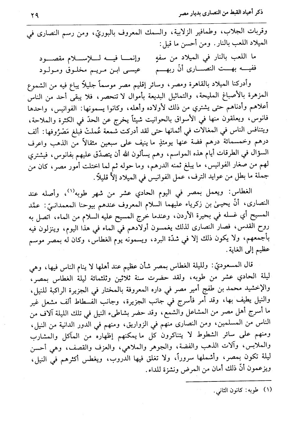 وأدركنا الميلاد بالقاهرة ومصر، وسائر إقليم مصر موسما جليلا يباع فيه من الشموع المزهرة بالأصباغ المليحة، والتماثيل البديعة بأموال لا تنحصر، فلا يبقى أحد من الناس أعلاهم وأدناهم حتى يشتري من ذلك لأولاده وأهله، وكانوا يسمونها: الفوانيس، واحدها فانوس، ويعلقون منها في الأسواق بالحوانيت شيئا يخرج عن الحدّ في الكثرة والملاحة، ويتنافس الناس في المغالات في أثمانها حتى لقد أدركت شمعة عملت فبلغ مصروفها: ألف درهم وخمسمائة درهم فضة عنها يومئذ ما ينيف على سبعين مثقالا من الذهب واعرف السؤال في الطرقات أيام هذه المواسم، وهم يسألون الله أن يتصدّق عليهم بفانوس، فيشتري لهم من صغار الفوانيس، ما يبلغ ثمنه الدرهم، وما حوله ثم لما اختلت أمور مصر، كان من جملة ما بطل من عوايد الترف، عمل الفوانيس في الميلاد إلّا قليلا.