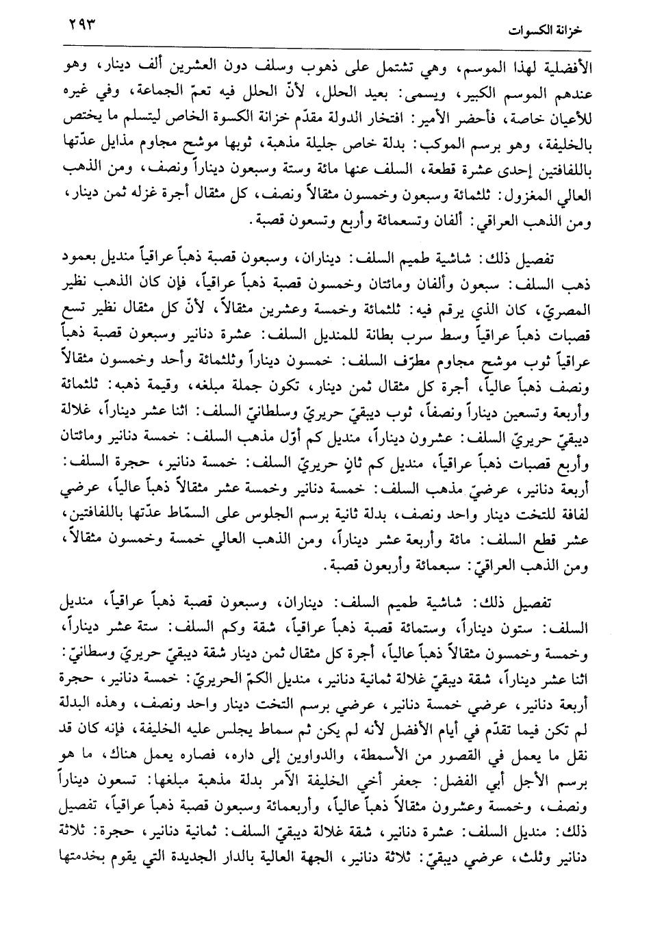 أربعة دنانير، عرضيّ مذهب السلف: خمسة دنانير وخمسة عشر مثقالا ذهبا عاليا، عرضي لفافة للتخت دينار واحد ونصف، بدلة ثانية برسم الجلوس على السّماط عدّتها باللفافتين، عشر قطع السلف: مائة وأربعة عشر دينارا، ومن الذهب العالي خمسة وخمسون مثقالا، ومن الذهب العراقيّ: سبعمائة وأربعون قصبة.
