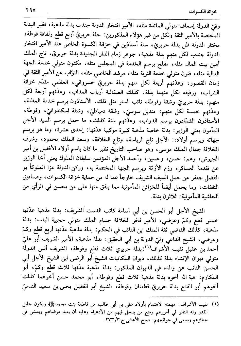 وفيّ الدولة إسعاف متولي المائدة مثله، الأمير افتخار الدولة جندب بدلة مذهبة، نظير البدلة المختصة بالأمير الثقة ولكل من غير هؤلاء المذكورين: حلة حريريّ أربع قطع ولفافة فوطة، مختار الدولة ظل بدلة حريريّ، ستة أستاذين في خزانة الكسوة الخاص عند الأمير افتخار الدولة جندب لكل منهم بدلة مذهبة، جوهر زمام الدار الجديدة بدلة حريريّ، تاج الملك أمين بيت المال مثله، مفلح برسم الخدمة في المجلس مثله، مكنون متولي خدمة الجهة العالية مثله، فنون متولي خدمة التربة مثله، مرشد الخاصي مثله، النوّاب عن الأمير الثقة في زمان القصور، وعدّتهم أربعة لكل منهم بدلة حريريّ خسرواني، العظمي مقدّم خزانة الشراب، ورفيقه لكل منهما بدلة. كذلك الصقالبة أرباب المداب، وعدّتهم أربعة لكل منهم: بدلة حريريّ وشقة وفوطة، نائب الستر مثل ذلك. الأستاذون برسم خدمة المظلة، وعدّتهم خمسة لكل منهم: منديل سوسيّ، وشقة دمياطيّ، وشقة اسكندرانيّ، وفوطة، الأستاذون الشدّادون برسم الدواب، وعدّتهم ستة كذلك، ما حمل برسم السيد الأجل المأمون يعني الوزير: بدلة خاصة مذهبة كبيرة موكبية عدّتها: إحدى عشرة، وما هو برسم جهاته وبرسم أولاده: الأجل تاج الرياسة، وتاج الخلافة، وسعد الملك محمود، وشرف الخلافة جمال الملك موسى، وهو صاحب التاريخ نظير ما كان باسم أولاد الأفضل بن أمير الجيوش، وهم: حسن، وحسين، وأحمد الأجل المؤتمن سلطان الملوك يعني أخا الوزير عن تقدمة العساكر، وزم الأزمّة وبرسم الجهة المختصة به، وركن الدولة عزا الملوكأ بو الفضل جعفر عن حمل السيف الشريف خارجا عما له من حماية خزانة الكسوات، وصناديق النفقات، وما يحمل أيضا للخزائن المأمونية مما ينفق منها على من يحسن في الرأي من الحاشية المأمونية: ثلاثون بدلة.