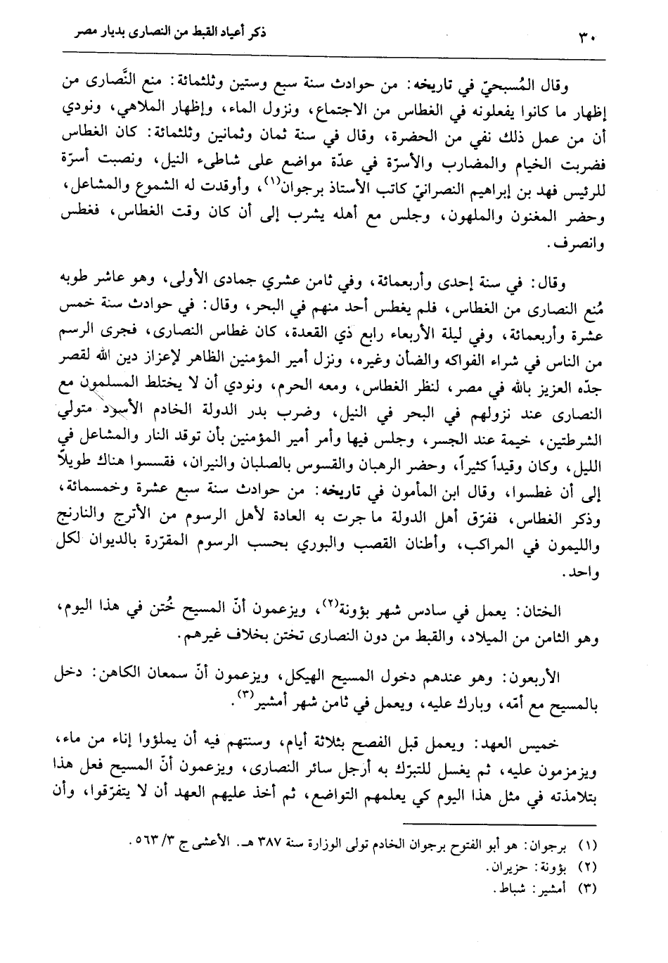 وقال المسبحيّ في تاريخه: من حوادث سنة سبع وستين وثلثمائة: منع النّصارى من إظهار ما كانوا يفعلونه في الغطاس من الاجتماع، ونزول الماء، وإظهار الملاهي، ونودي أن من عمل ذلك نفي من الحضرة، وقال في سنة ثمان وثمانين وثلثمائة: كان الغطاس فضربت الخيام والمضارب والأسرّة في عدّة مواضع على شاطىء النيل، ونصبت أسرّة للرئيس فهد بن إبراهيم النصرانيّ كاتب الأستاذ برجوان «1» ، وأوقدت له الشموع والمشاعل، وحضر المغنون والملهون، وجلس مع أهله يشرب إلى أن كان وقت الغطاس، فغطس وانصرف.
