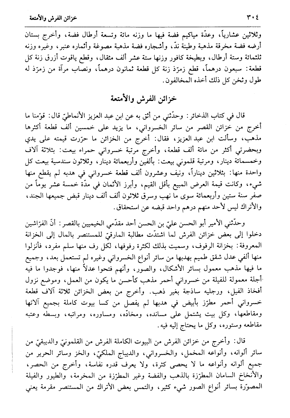 قال في كتاب الذخائر: وحدّثني من أثق به عن ابن عبد العزيز الأنماطيّ قال: قوّمنا ما أخرج من خزائن القصر من سائر الخسرواني، ما يزيد على خمسين ألف قطعة أكثرها مذهب، وسألت ابن عبد العزيز، فقال: أخرج من الخزائن ما حرّرت قيمته على يدي وبحضرتي أكثر من مائة ألف قطعة، وأخرج مرتبة خسرواني حمراء بيعت: بثلاثة آلاف وخمسمائة دينار، ومرتبة قلموني بيعت: بألفين وأربعمائة دينار، وثلاثون سندسية بيعت كل واحدة منها: بثلاثين دينارا، ونيف وعشرون ألف قطعة خسرواني في هدبه لم يقطع منها شيء، وكانت قيمة العرض المبيع بأقل القيم، وأبرز الأثمان في مدّة خمسة عشر يوما من صفر سنة ستين وأربعمائة سوى ما نهب وسرق ثلاثون ألف ألف دينار قبض جميعها الجند، والأتراك ليس لأحد منهم درهم واحد قبضه عن استحقاق.