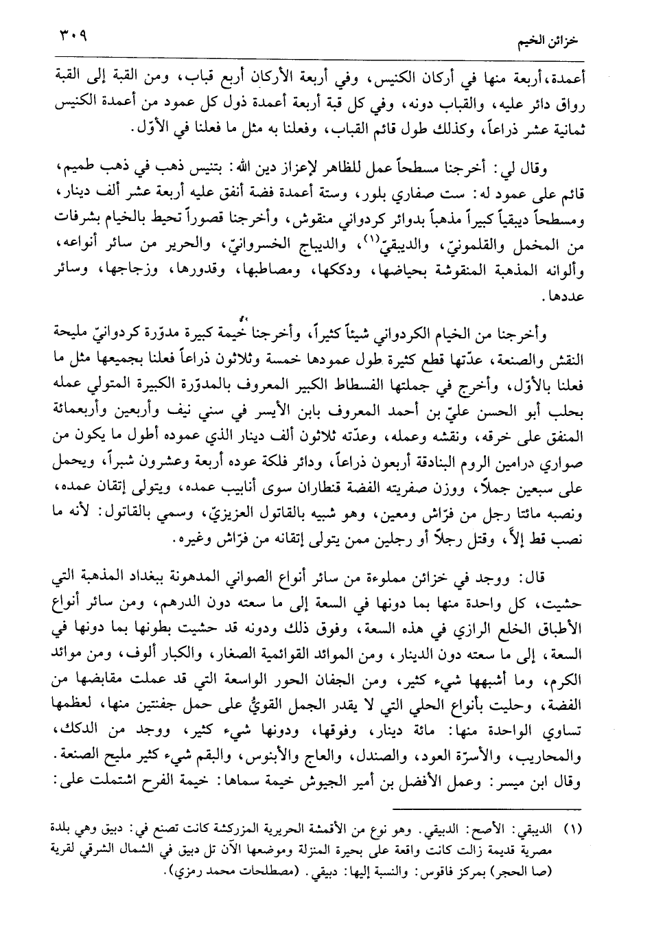 وأخرجنا من الخيام الكردواني شيئا كثيرا، وأخرجنا خيمة كبيرة مدوّرة كردوانيّ مليحة النقش والصنعة، عدّتها قطع كثيرة طول عمودها خمسة وثلاثون ذراعا فعلنا بجميعها مثل ما فعلنا بالأوّل، وأخرج في جملتها الفسطاط الكبير المعروف بالمدوّرة الكبيرة المتولي عمله بحلب أبو الحسن عليّ بن أحمد المعروف بابن الأيسر في سني نيف وأربعين وأربعمائة المنفق على خرقه، ونقشه وعمله، وعدّته ثلاثون ألف دينار الذي عموده أثول ما يكون من صواري درامين الروم البنادقة أربعون ذراعا، ودائر فلكة عوده أربعة وعشرون شبرا، ويحمل على سبعين جملا، ووزن صفريته الفضة قنطاران سوى أنابيب عمده، ويتولى إتقان عمده، ونصبه مائتا رجل من فرّاش ومعين، وهو شبيه بالقاتول العزيزيّ، وسمي بالقاتول: لأنه ما نصب قط إلّا، وقتل رجلا أو رجلين ممن يتولى إتقانه من فرّاش وغيره.