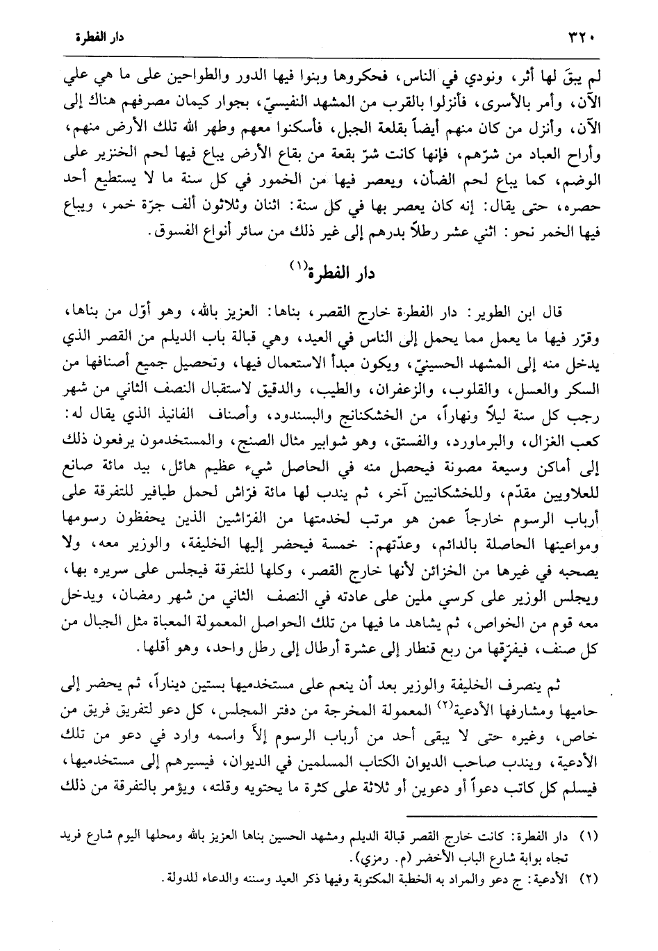 ثم ينصرف الخليفة والوزير بعد أن ينعم على مستخدميها بستين دينارا، ثم يحضر إلى حاميها ومشارفها الأدعية «2» المعمولة المخرجة من دفتر المجلس، كل دعو لتفريق فريق من خاص، وغيره حتى لا يبقى أحد من أرباب الرسوم إلّا واسمه وارد في دعو من تلك الأدعية، ويندب صاحب الديوان الكتاب المسلمين في الديوان، فيسيرهم إلى مستخدميها، فيسلم كل كاتب دعوا أو دعوين أو ثلاثة على كثرة ما يحتويه وقلته، ويؤمر بالتفرقة من ذلك