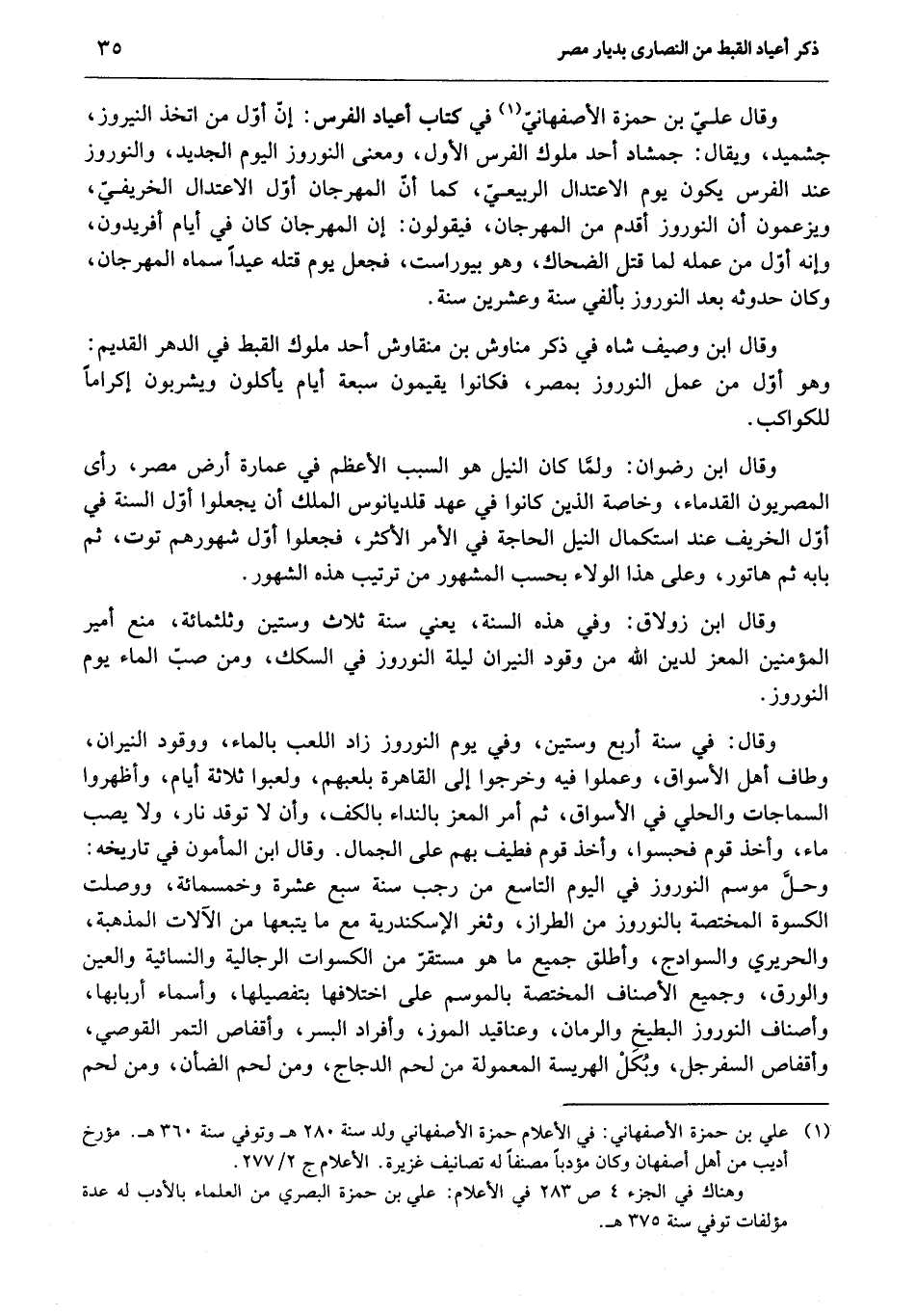 وقال ابن زولاق: وفي هذه السنة، يعني سنة ثلاث وستين وثلثمائة، منع أمير المؤمنين المعز لدين الله من وقود النيران ليلة النوروز في السكك، ومن صبّ الماء يوم النوروز.