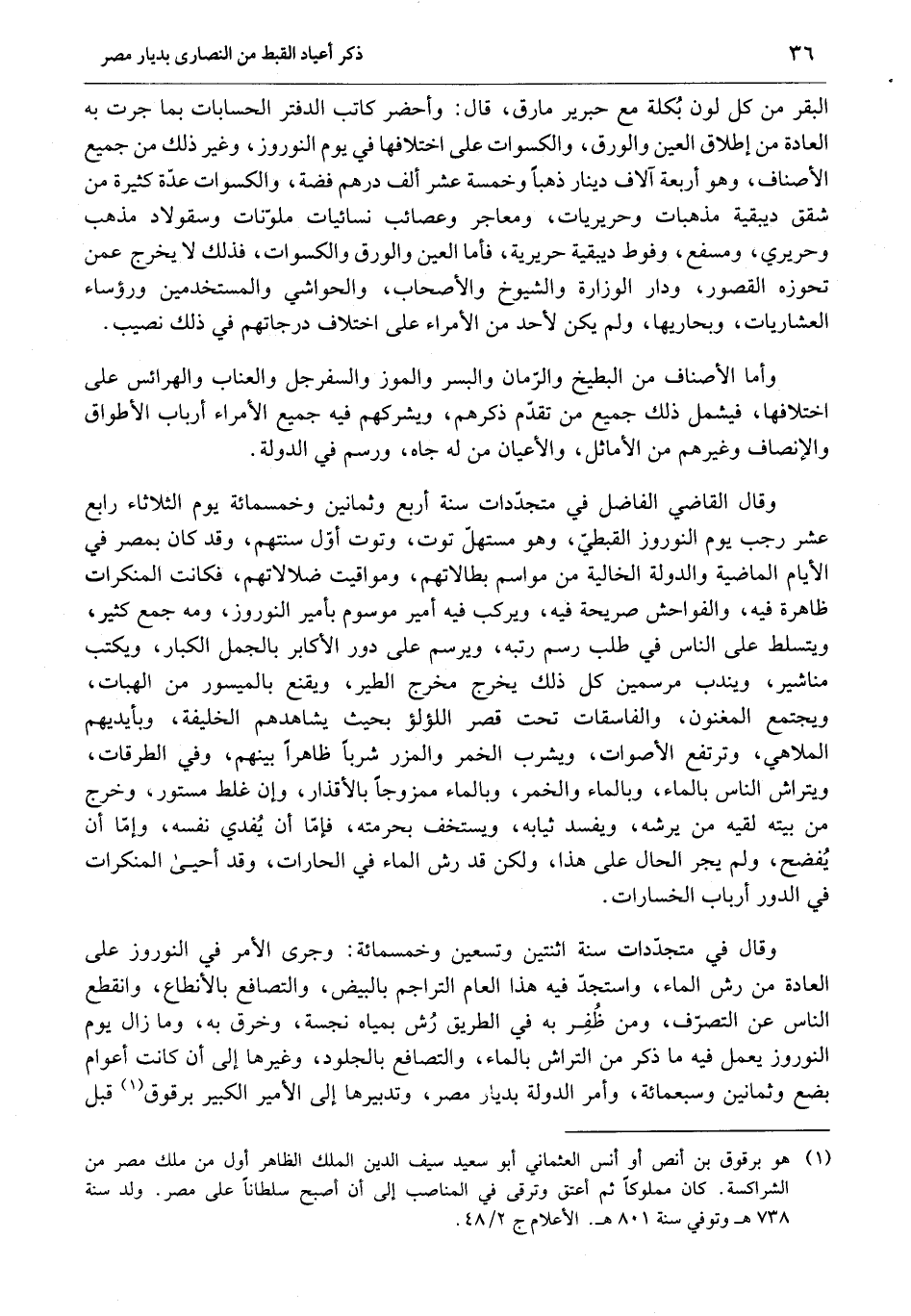 وقال في متجدّدات سنة اثنتين وتسعين وخمسمائة: وجرى الأمر في النوروز على العادة من رش الماء، واستجدّ فيه هذا العام التراجم بالبيض، والتصافع بالأنطاع، وانقطع الناس عن التصرّف، ومن ظفر به في الطريق رش بمياه نجسة، وخرق به، وما زال يوم النوروز يعمل فيه ما ذكر من التراش بالماء، والتصافع بالجلود، وغيرها إلى أن كانت أعوام بضع وثمانين وسبعمائة، وأمر الدولة بديار مصر، وتدبيرها إلى الأمير الكبير برقوق «1» قبل