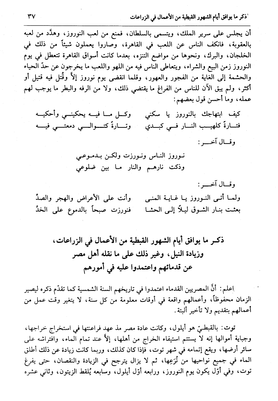 ذكر ما يوافق أيام الشهور القبطية من الأعمال في الزراعات، وزيادة النيل، وغير ذلك على ما نقله أهل مصر عن قدمائهم واعتمدوا عليه في أمورهم